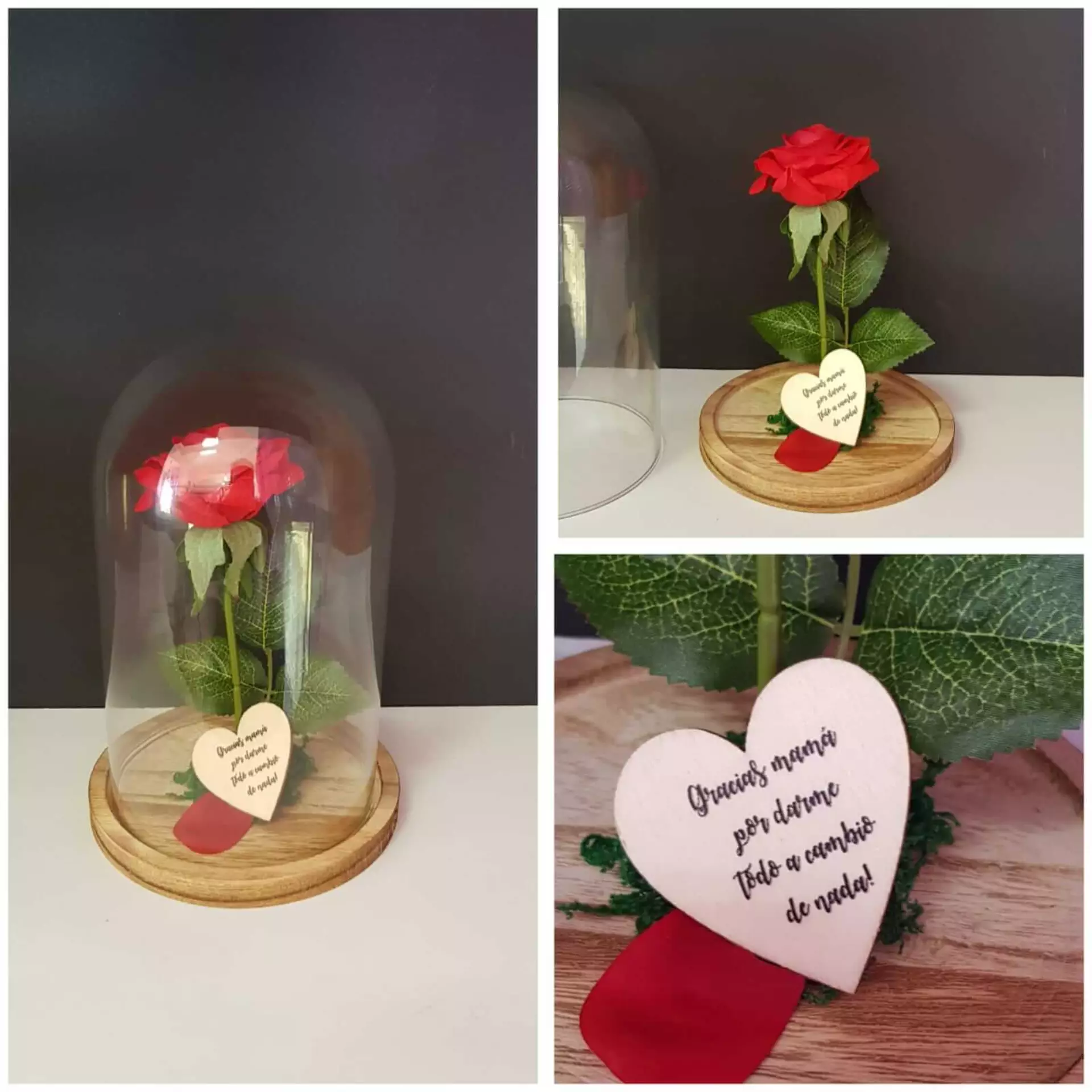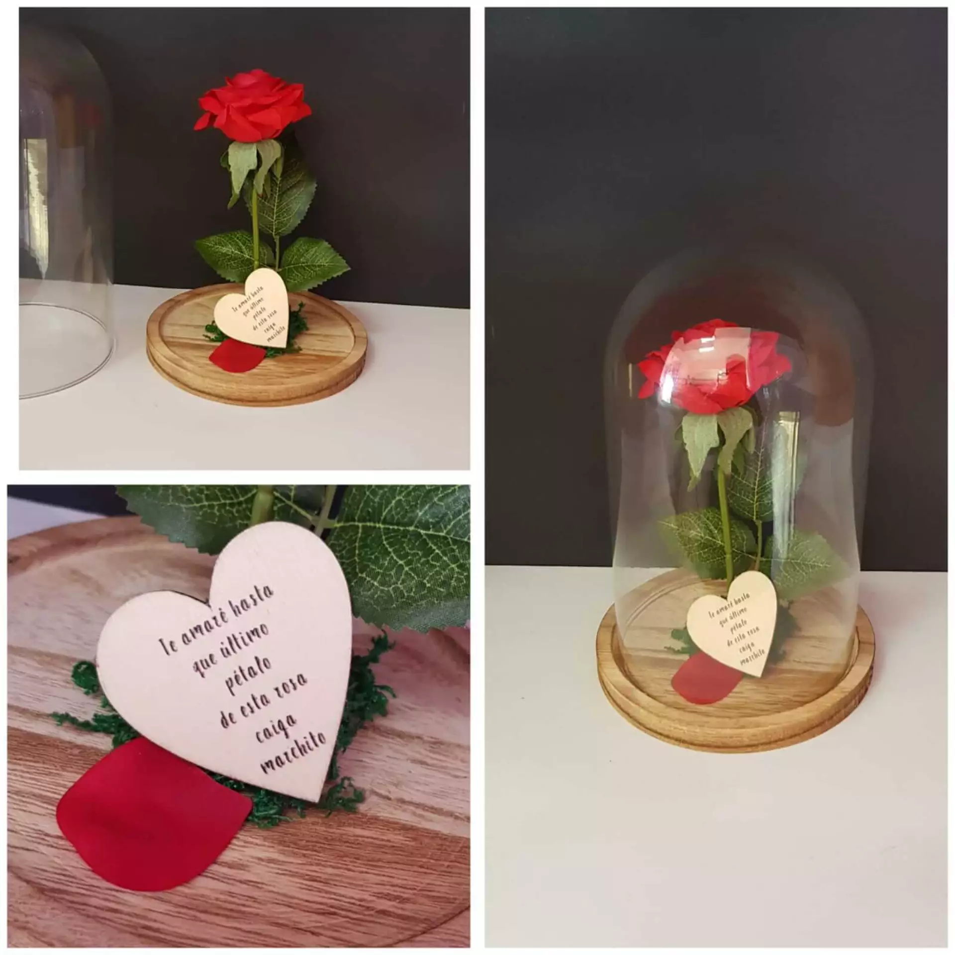 Cúpula de cristal con rosa de latex y con un corazon de madera personalizado.