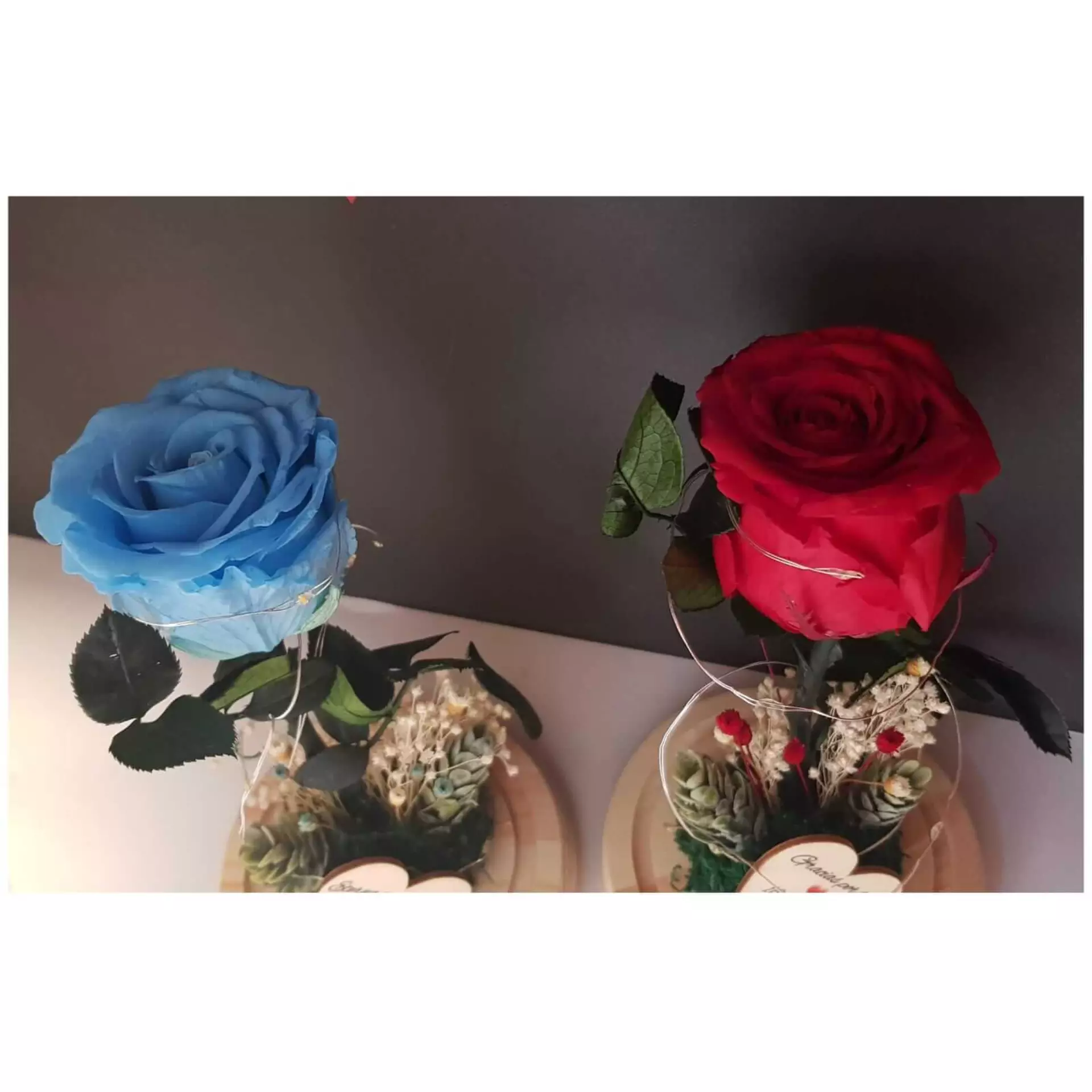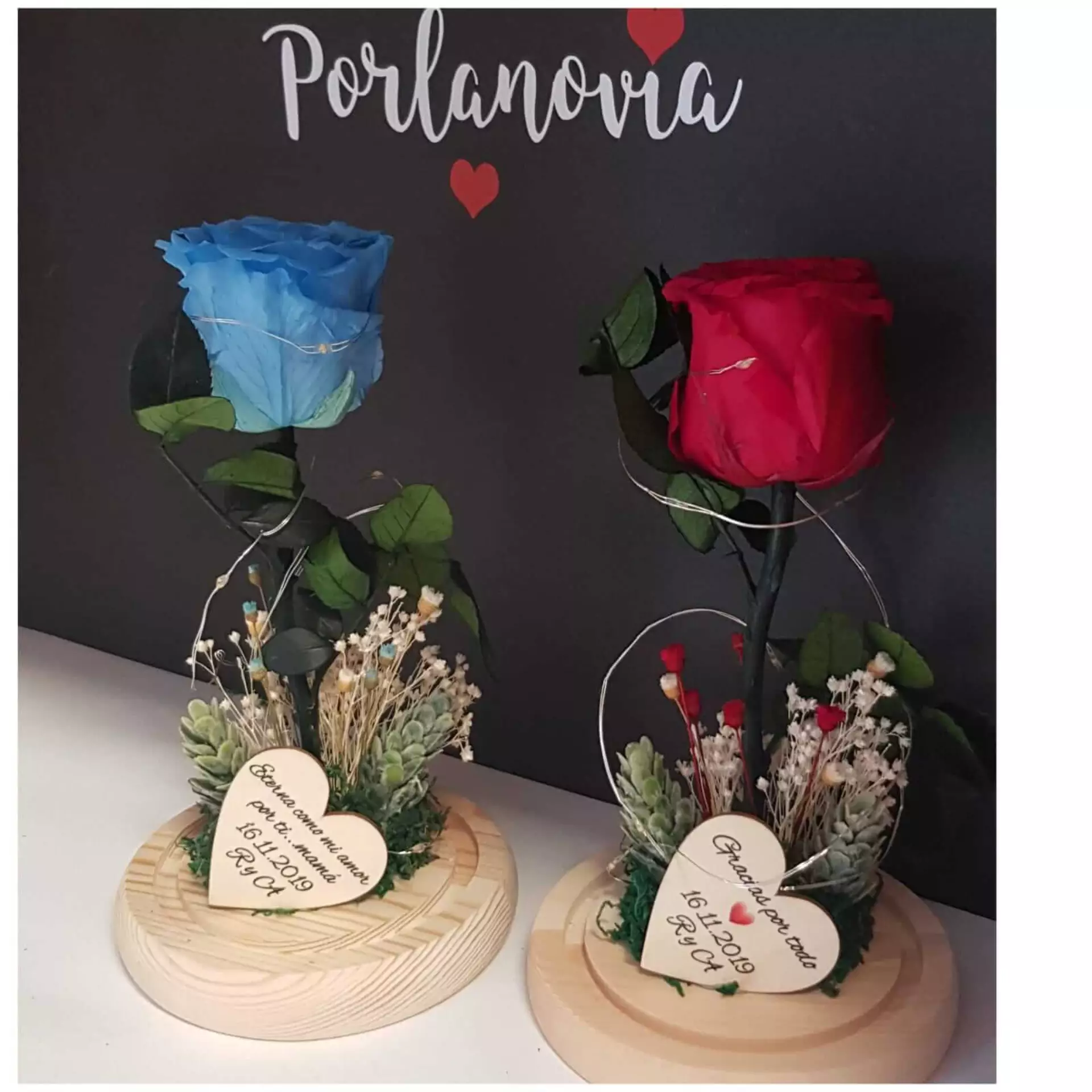 Cúpula de cristal con rosa preservada y arreglo floral,compuesto de flores naturales secas preservadas con luces led,con un corazon de madera personalizado.