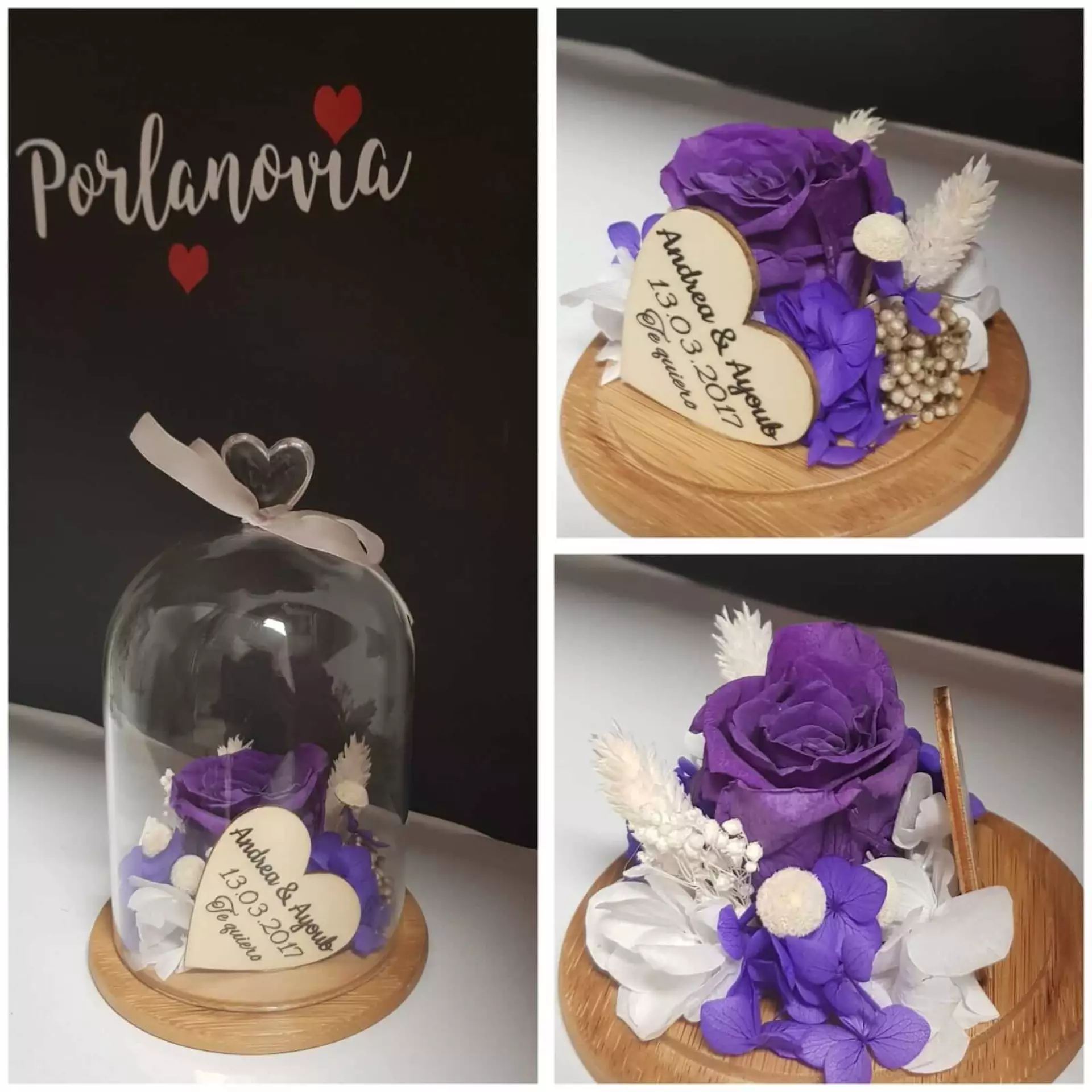 Cúpula de cristal con rosa preservada y arreglo floral,compuesto de flores preservadas, con un corazon de madera personalizado.