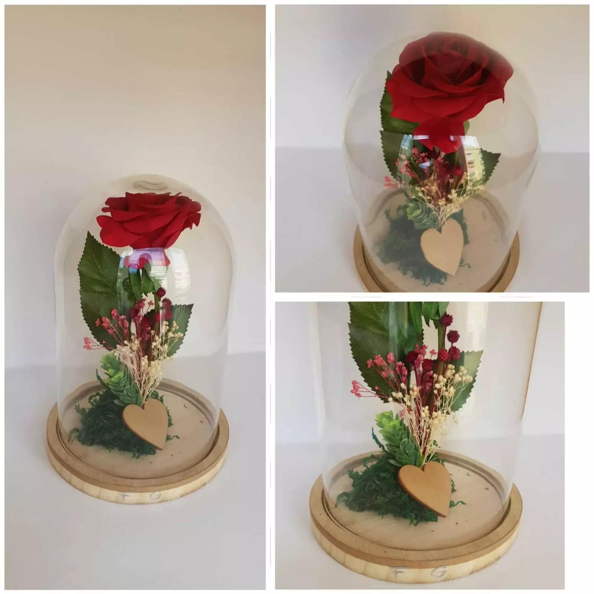 Cúpula de cristal con rosa de latex y arreglo floral,compuesto de flores naturales secas y artificiales