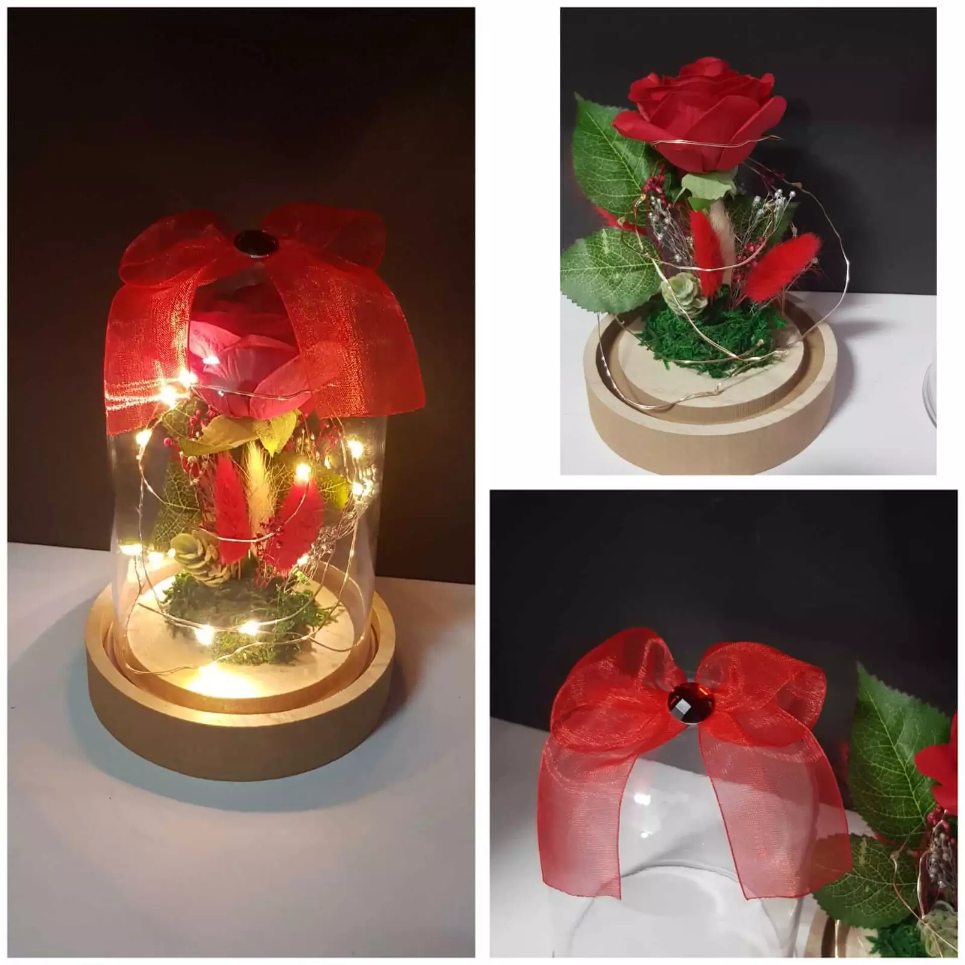 Cúpula de plastico con rosa de latex y arreglo floral,compuesto de flores naturales secas y artificiales con luces led