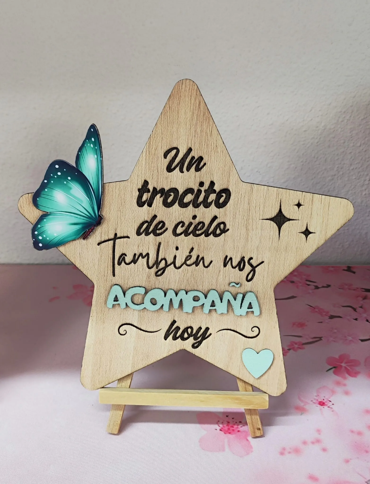 El diseño incluye el texto ‘Un trocito de cielo también nos acompaña hoy’ con la palabra ‘ACOMPAÑA’ en relieve celeste, decorado con una mariposa verde turquesa, estrellas brillantes y dos corazones blancos.
