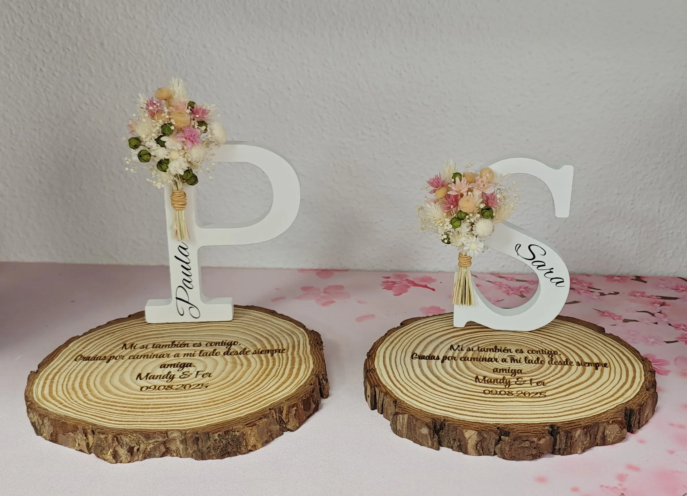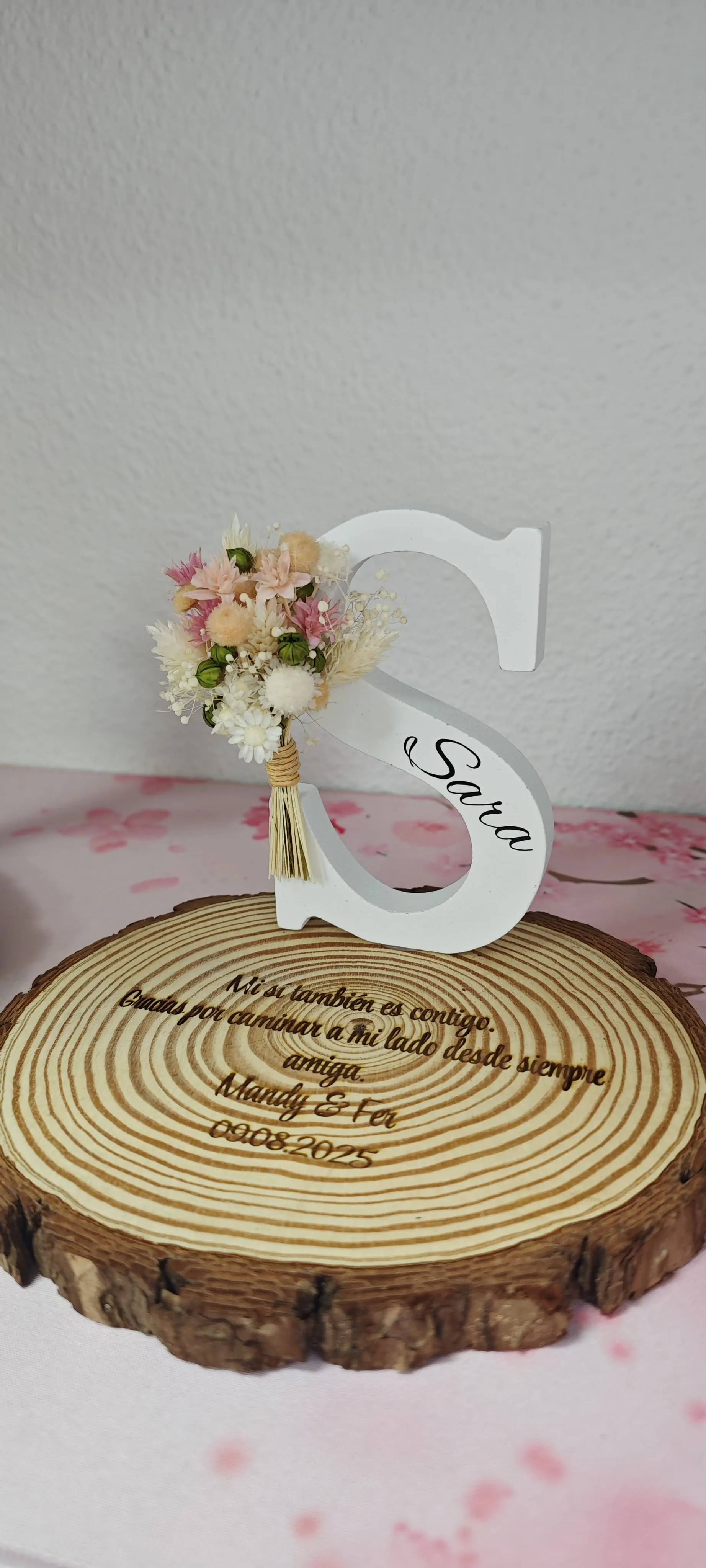 Letra decorativa con flores preservadas y base personalizada de madera con grabado láser.