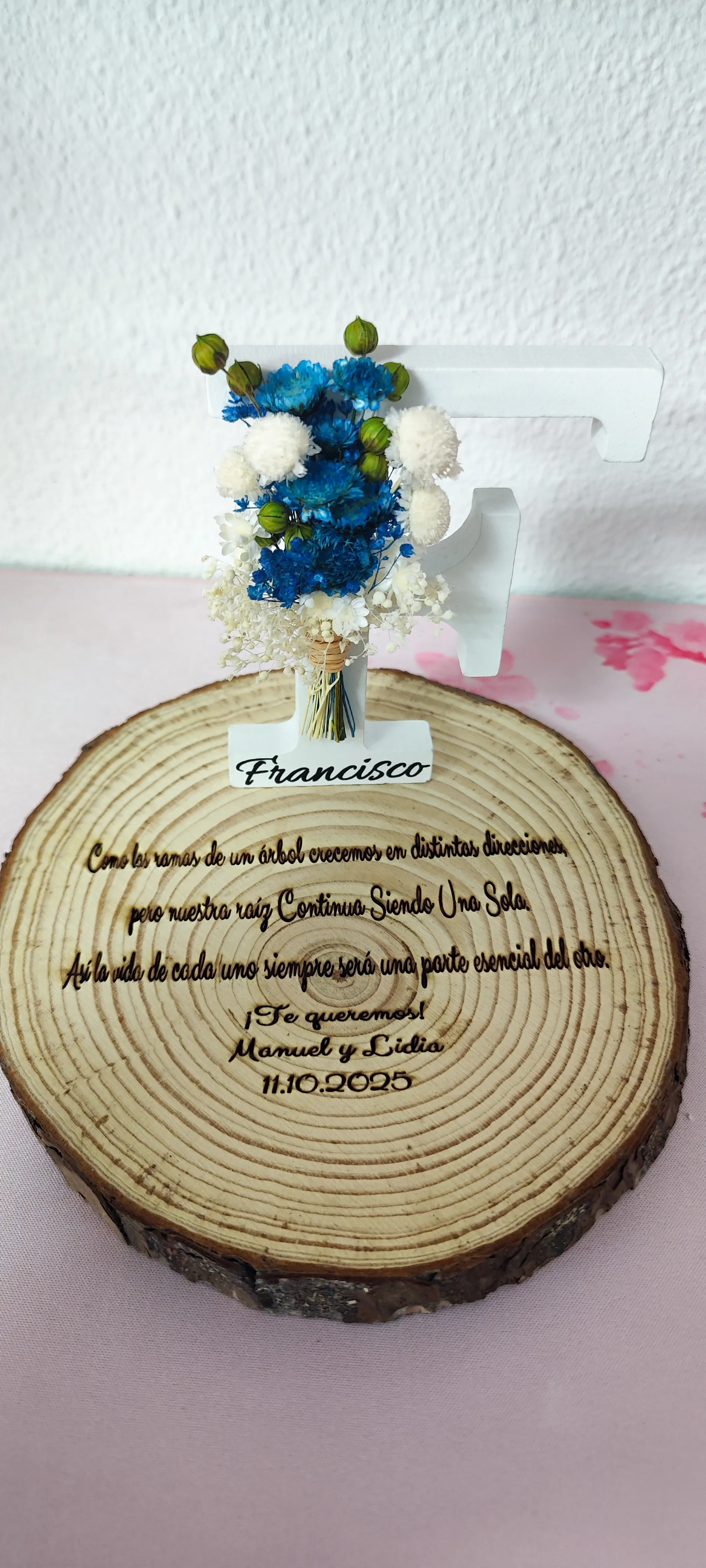 Letra decorativa con flores preservadas y base personalizada de madera con grabado láser.