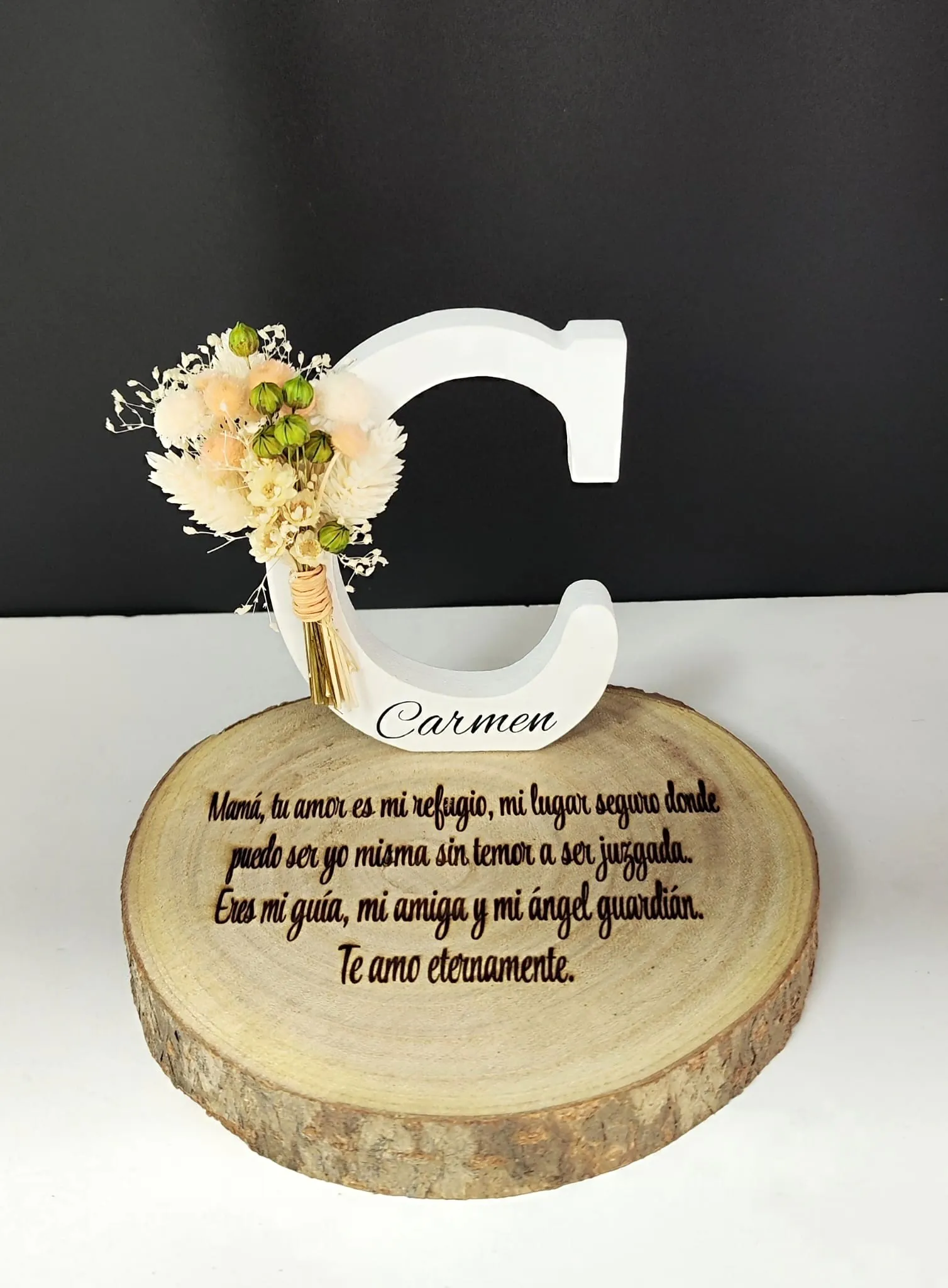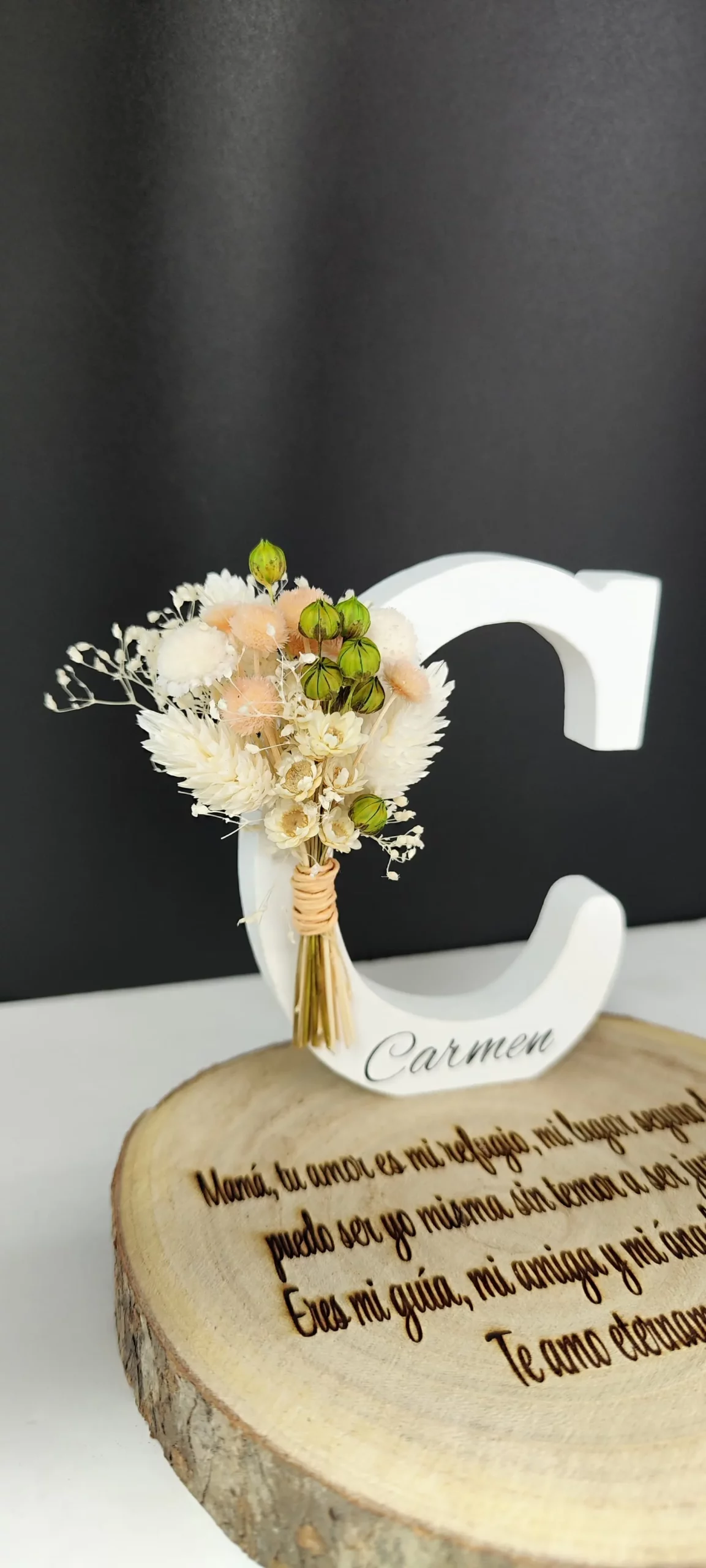 Añade un toque especial a cualquier espacio con nuestra Letra Decorativa con Flores Preservadas y Base Personalizada de Madera. Este diseño único combina la belleza de las flores preservadas con el encanto rústico de una rodaja de madera, que puedes personalizar con Transferencia de imagen sobre madera o grabado láser.