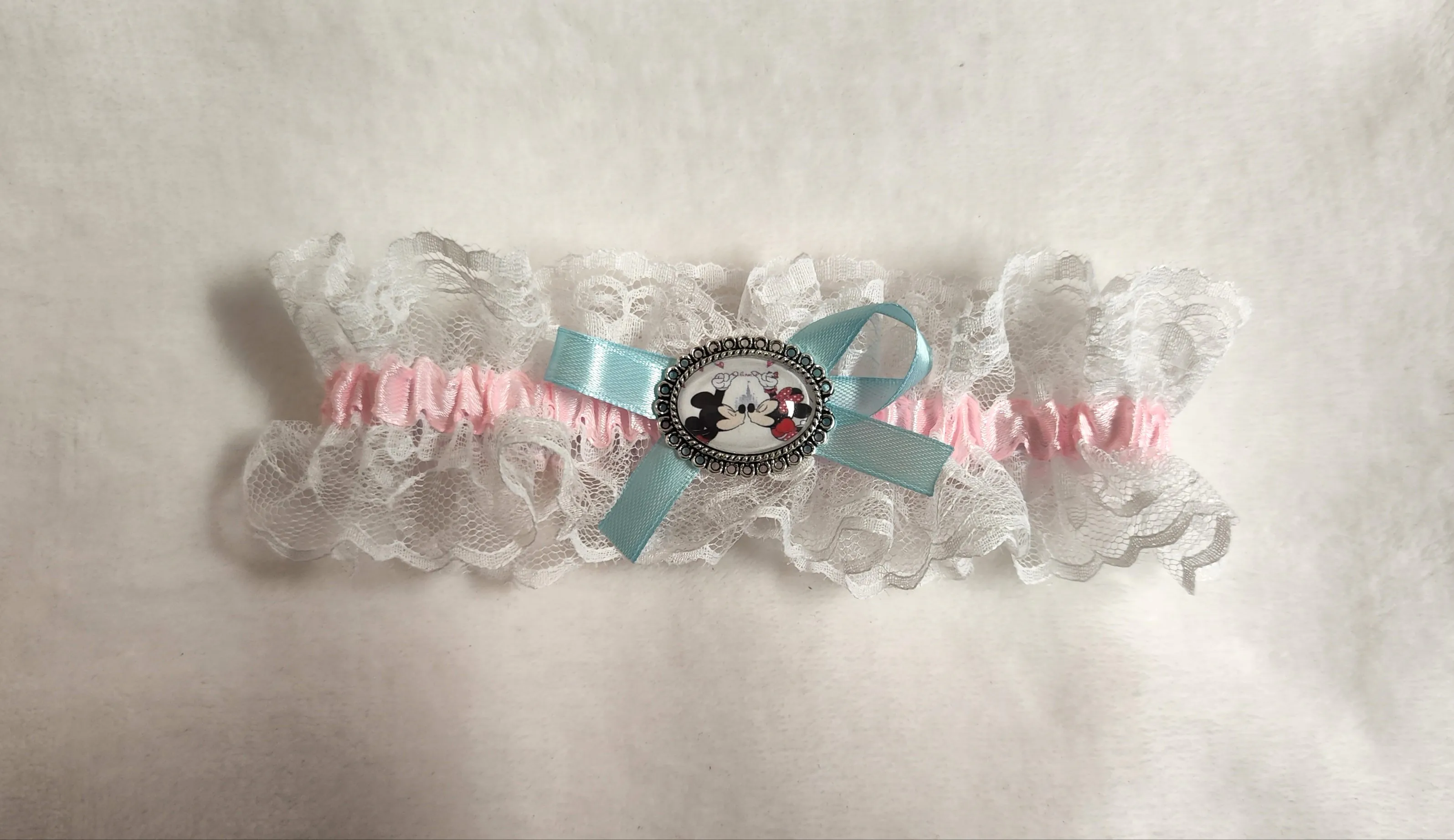 - Materiales: Encaje blanco suave y cinta de raso rosa y azul