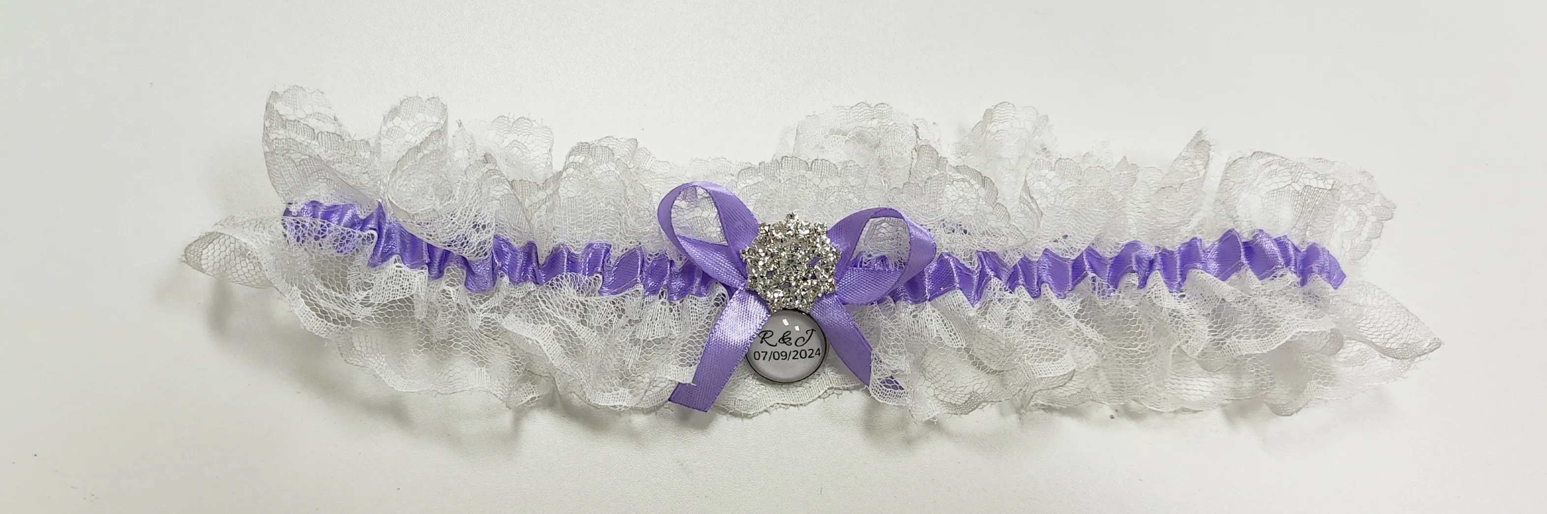 Esta liga personalizada es un detalle único y significativo para bodas. Con un diseño en encaje blanco y un lazo en color malva, incluye un colgante tipo mini camafeo que puede personalizarse con iniciales, fechas o un diseño especial. Es ideal para regalar a las damas de honor, amigas de la novia o como un recuerdo especial de una despedida de soltera.