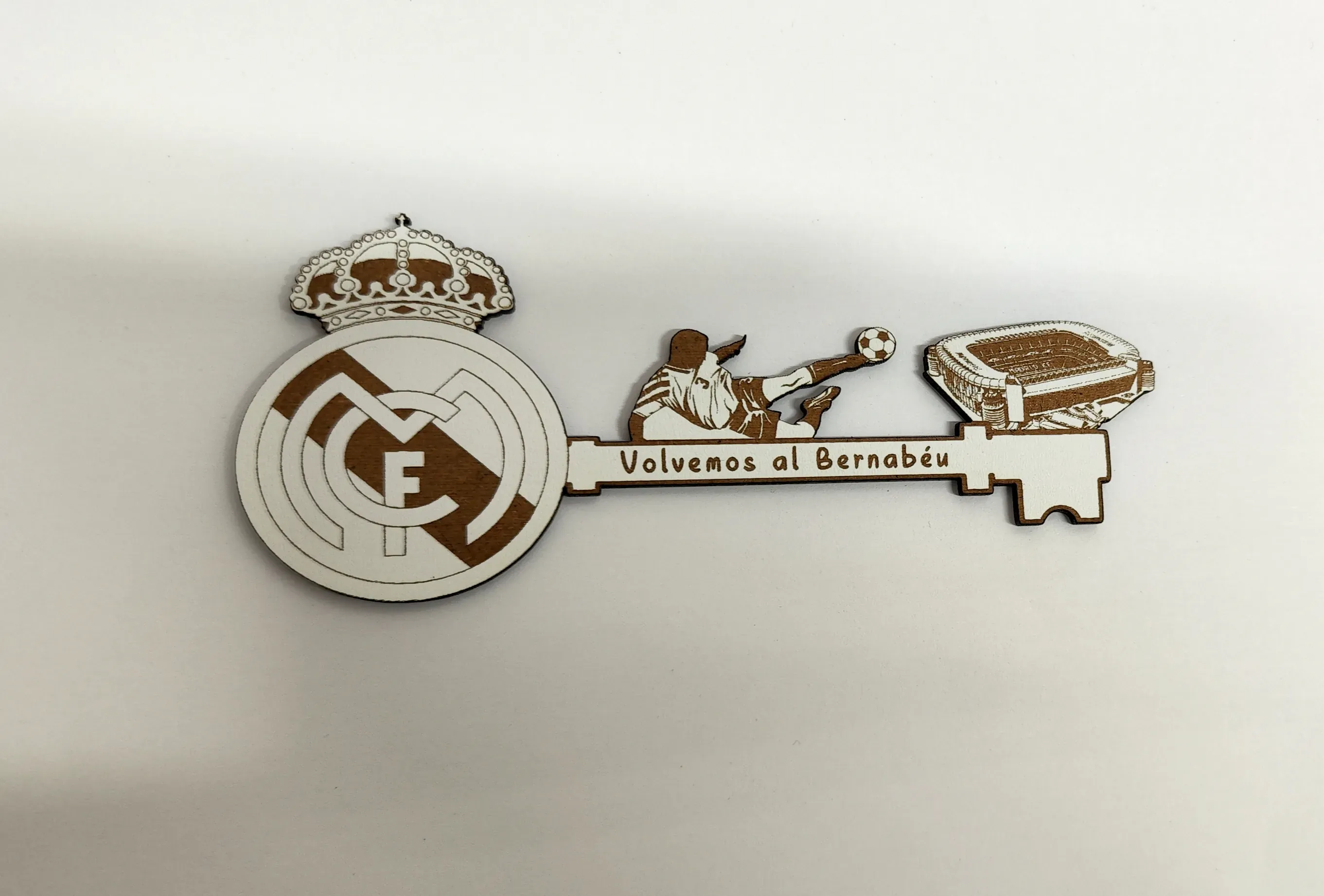 Llave mágica personalizada de fútbol en madera con grabado láser, decorada con escudo, silueta de jugador y estadio del equipo a elegir.