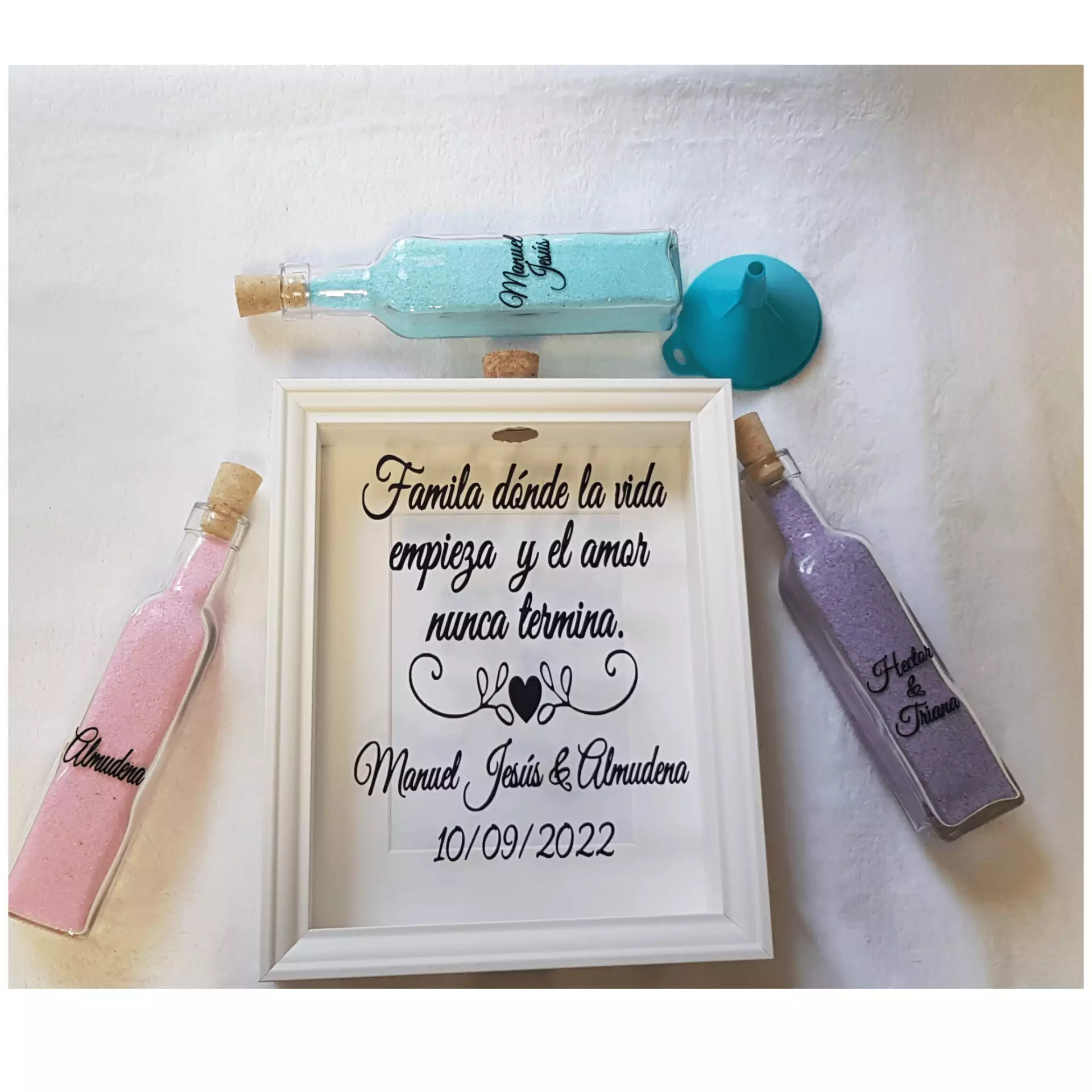 La ceremonia de la arena es un ritual elegante y único que se puede personalizar de muchas maneras. Una forma de hacerla aún más especial es utilizando un marco y botes personalizados para la ceremonia.
