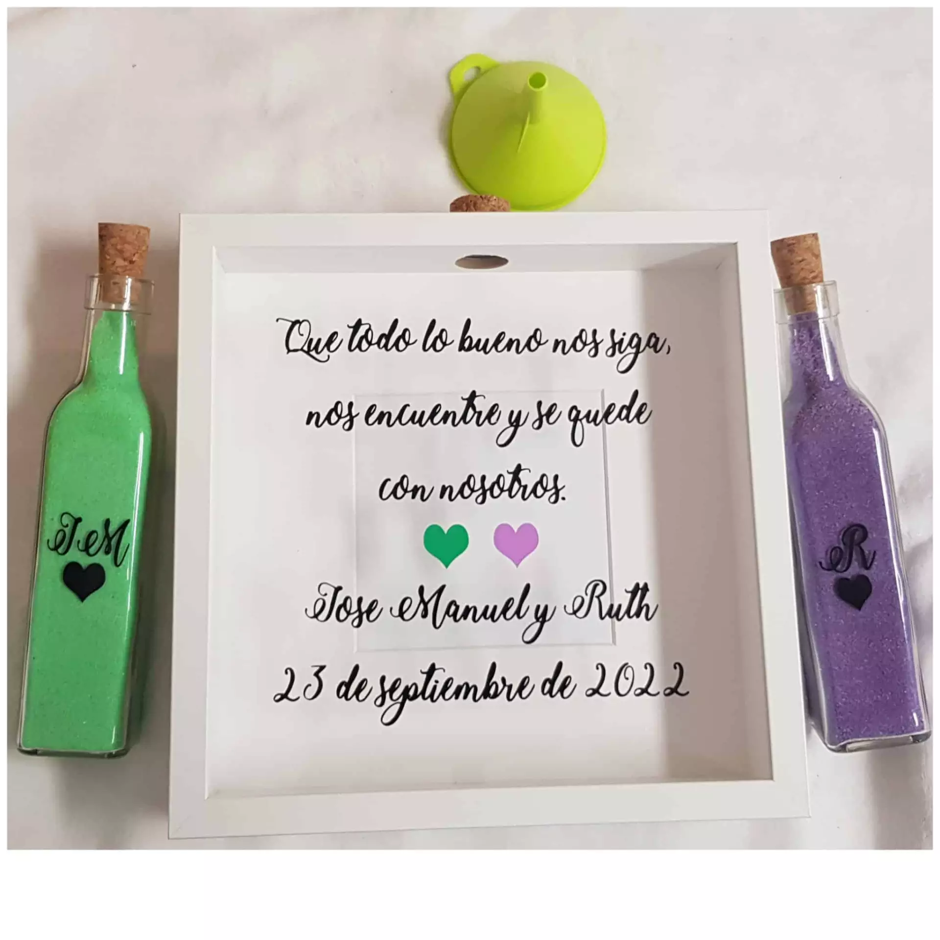 El marco puede ser personalizado con detalles elegantes y simbólicos que sean importantes para la pareja, como sus nombres, la fecha de la ceremonia, símbolos que representen su amor, entre otros. Este marco servirá como el soporte para los botes de arena y será una hermosa pieza de decoración para la pareja después de la ceremonia.