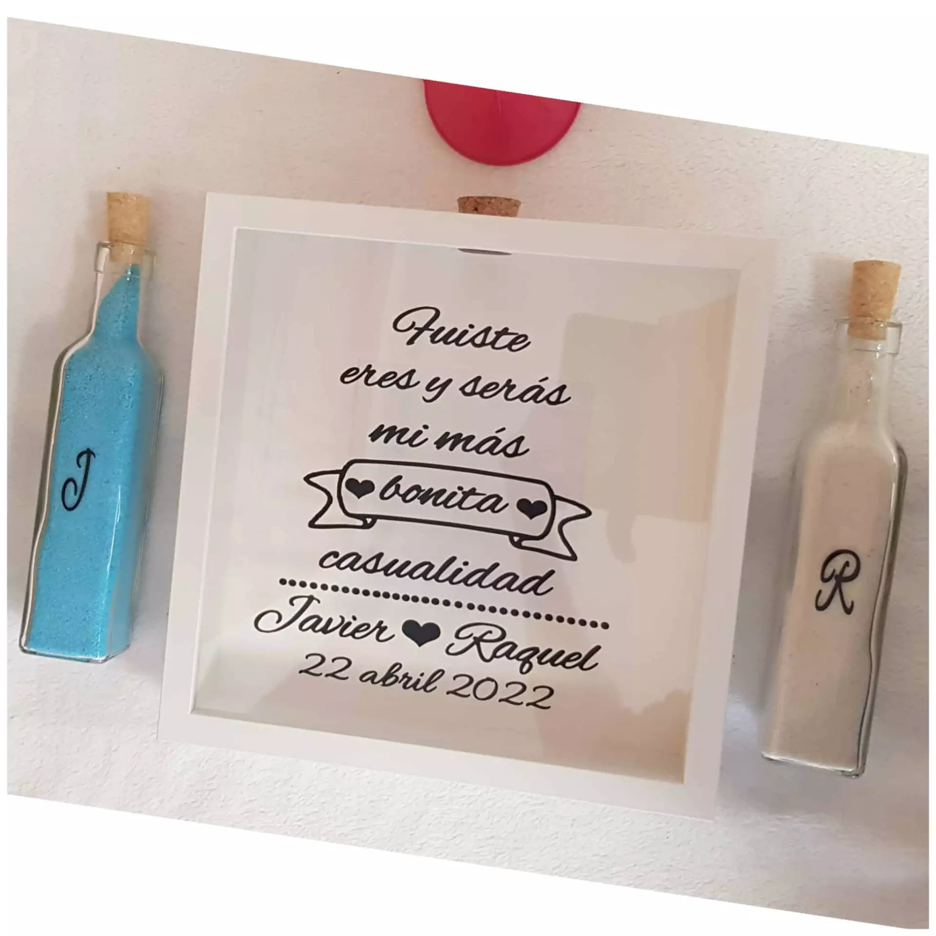 El marco puede ser personalizado con detalles elegantes y simbólicos que sean importantes para la pareja, como sus nombres, la fecha de la ceremonia, símbolos que representen su amor, entre otros. Este marco servirá como el soporte para los botes de arena y será una hermosa pieza de decoración para la pareja después de la ceremonia.