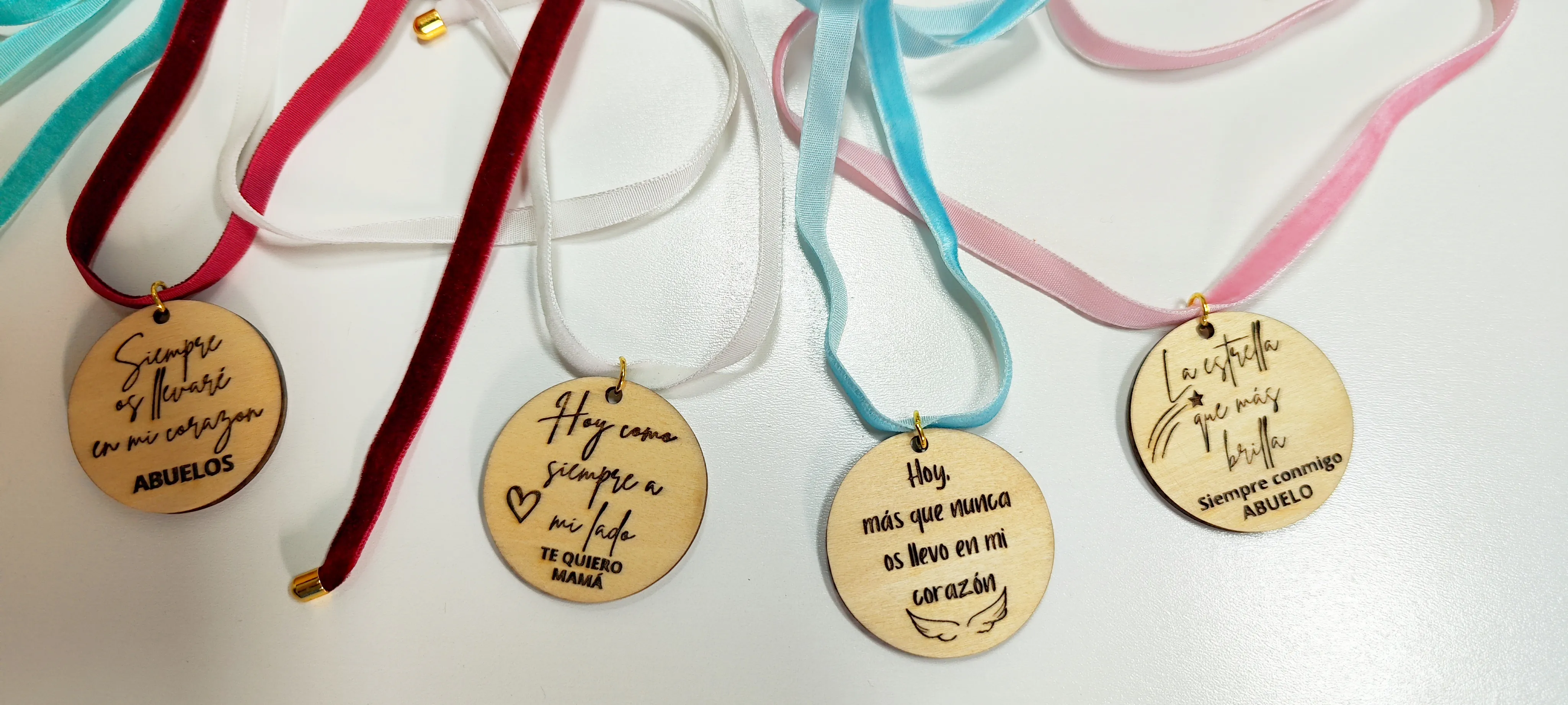 Estas medallas de madera, grabadas con mensajes conmemorativos, añaden un toque personal y emocional a cualquier ramo de novia. Cada medalla lleva inscrito un mensaje especial como “La estrella que más brilla, siempre conmigo, ABUELO”, ideal para recordar a seres queridos en días tan significativos como el de una boda. Las cintas de terciopelo, disponibles en varios colores, permiten atar fácilmente las medallas al ramo, integrándolas armoniosamente con el conjunto floral.