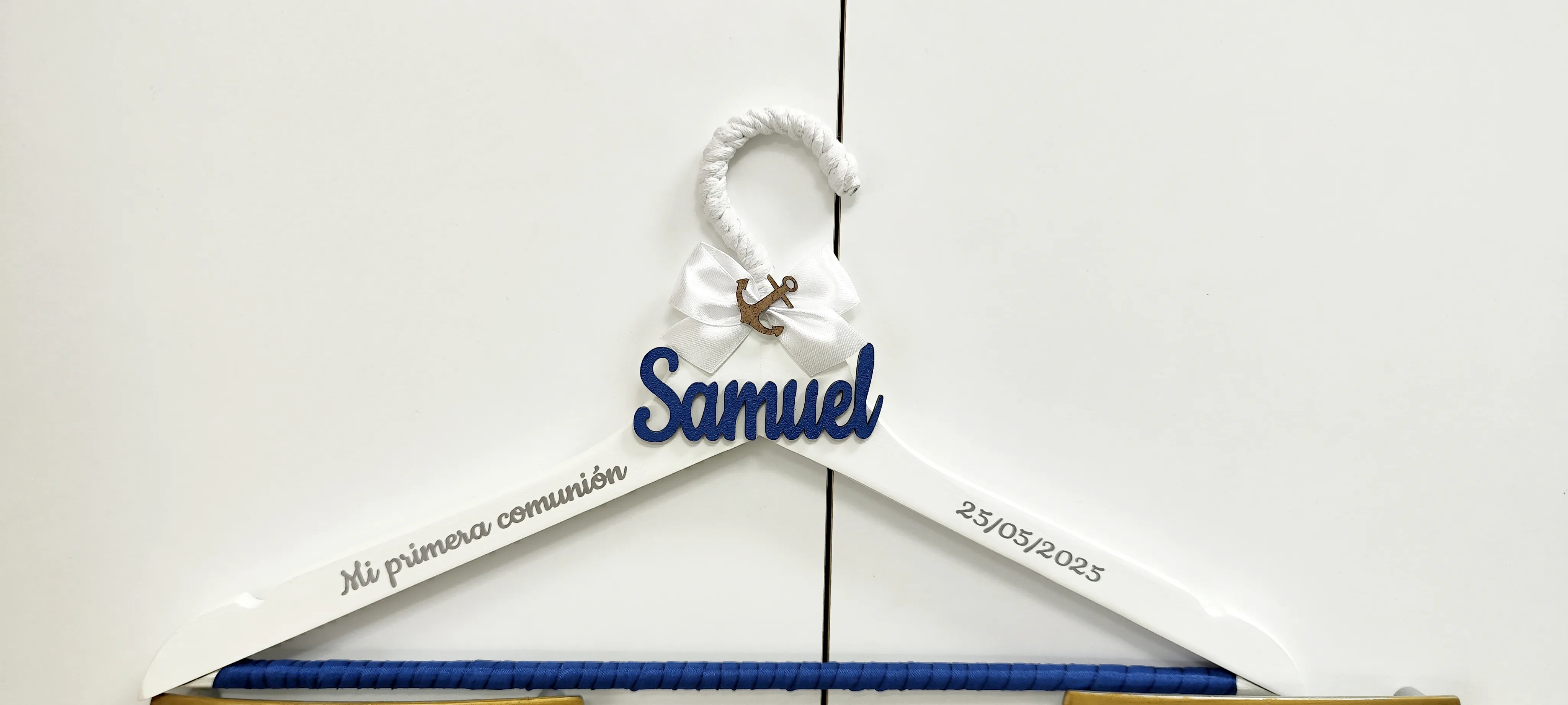 Percha personalizada para Primera Comunión en madera de color blanco, con temática náutica.