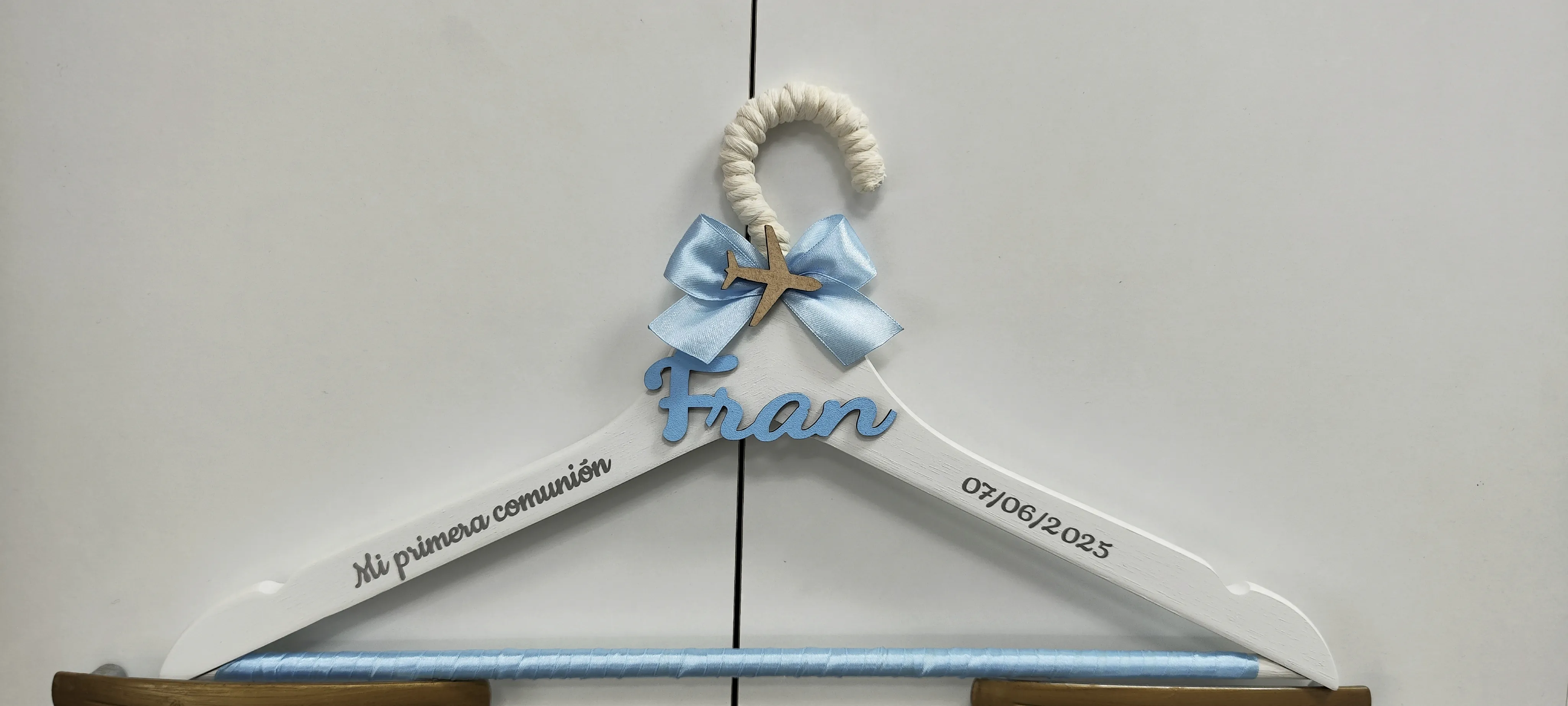 Percha personalizada para Primera Comunión en madera de color blanco.