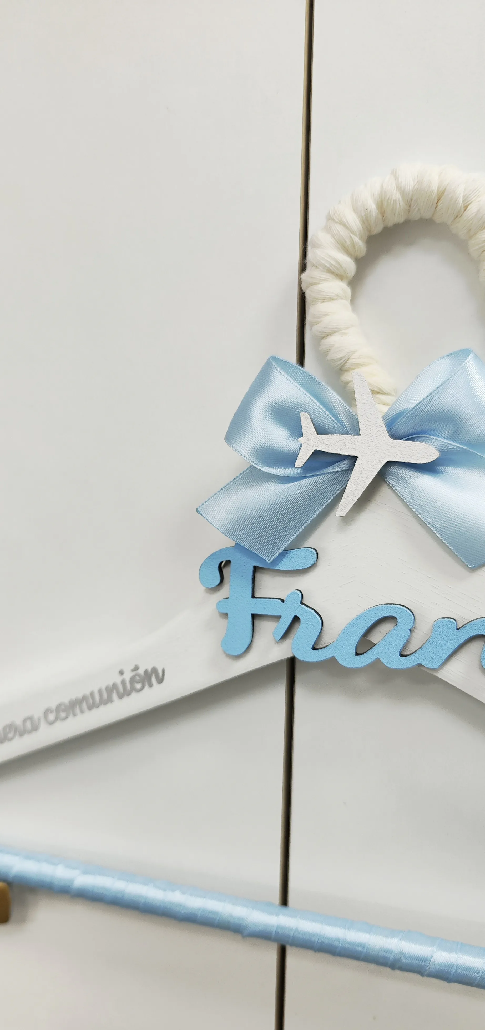 Incluye lazo satinado azul celeste, avión de madera, y nombre del niño en madera de color azul. La barra inferior está forrada en azul celeste.