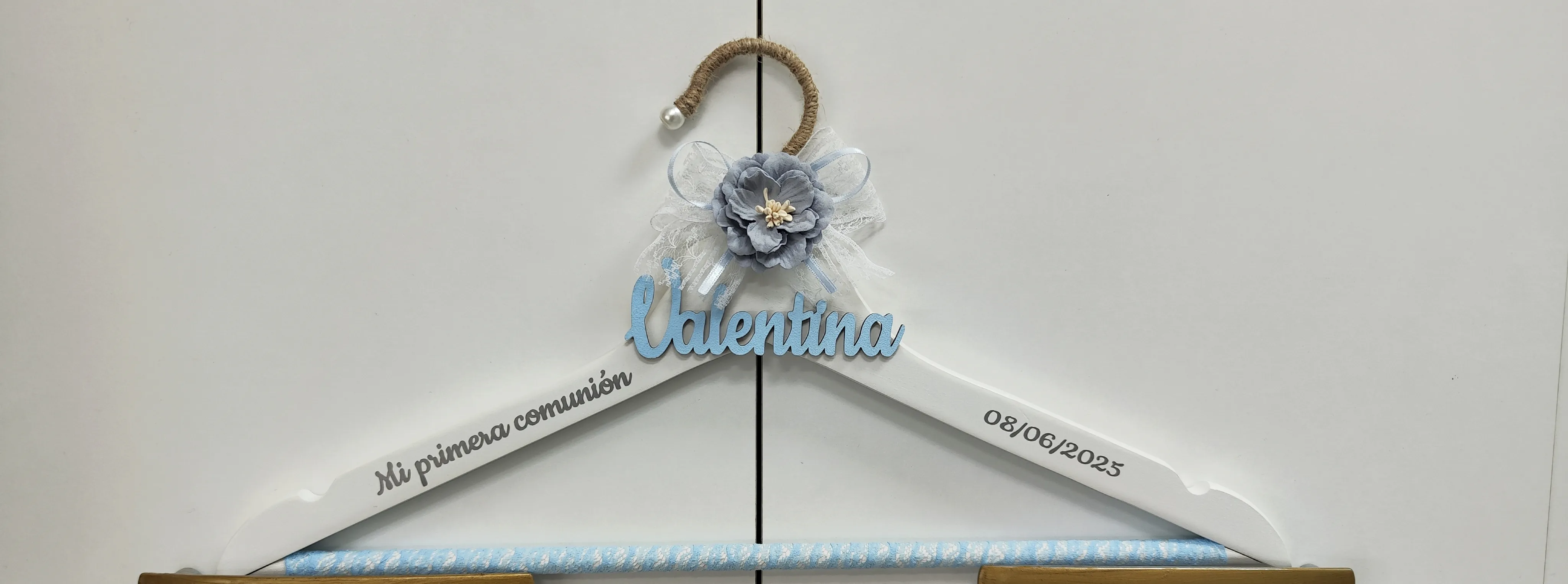 Percha personalizada para Primera Comunión en madera de color blanco, con elegante decoración en tonos gris y azul.
