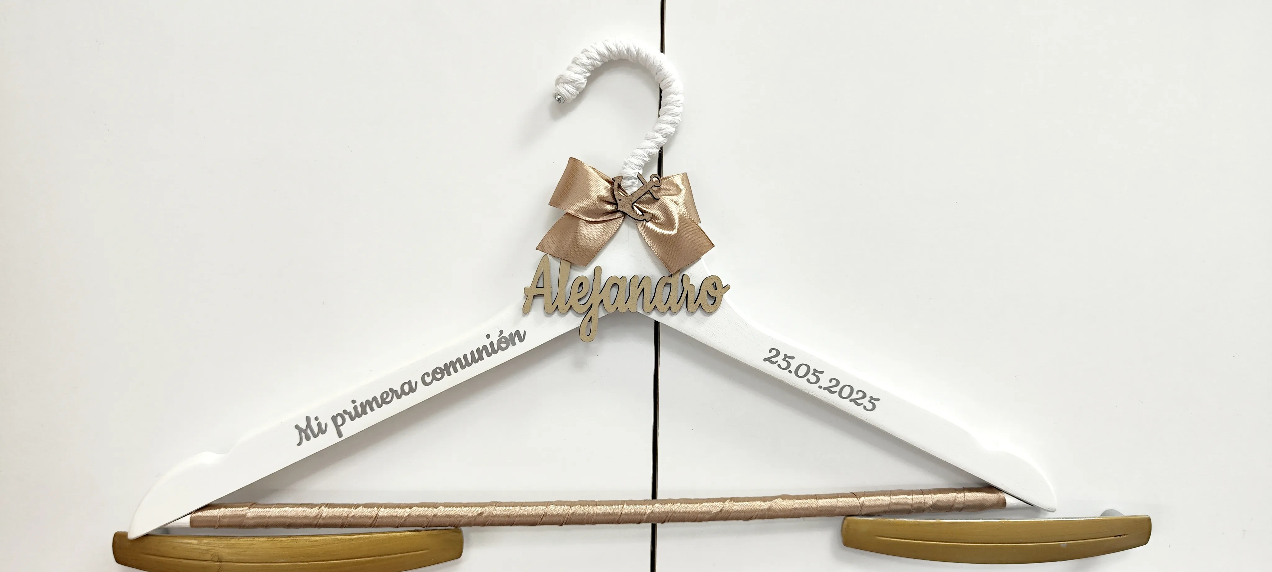 Percha personalizada para Primera Comunión en madera de color blanco, con elegante decoración en tonos dorados.