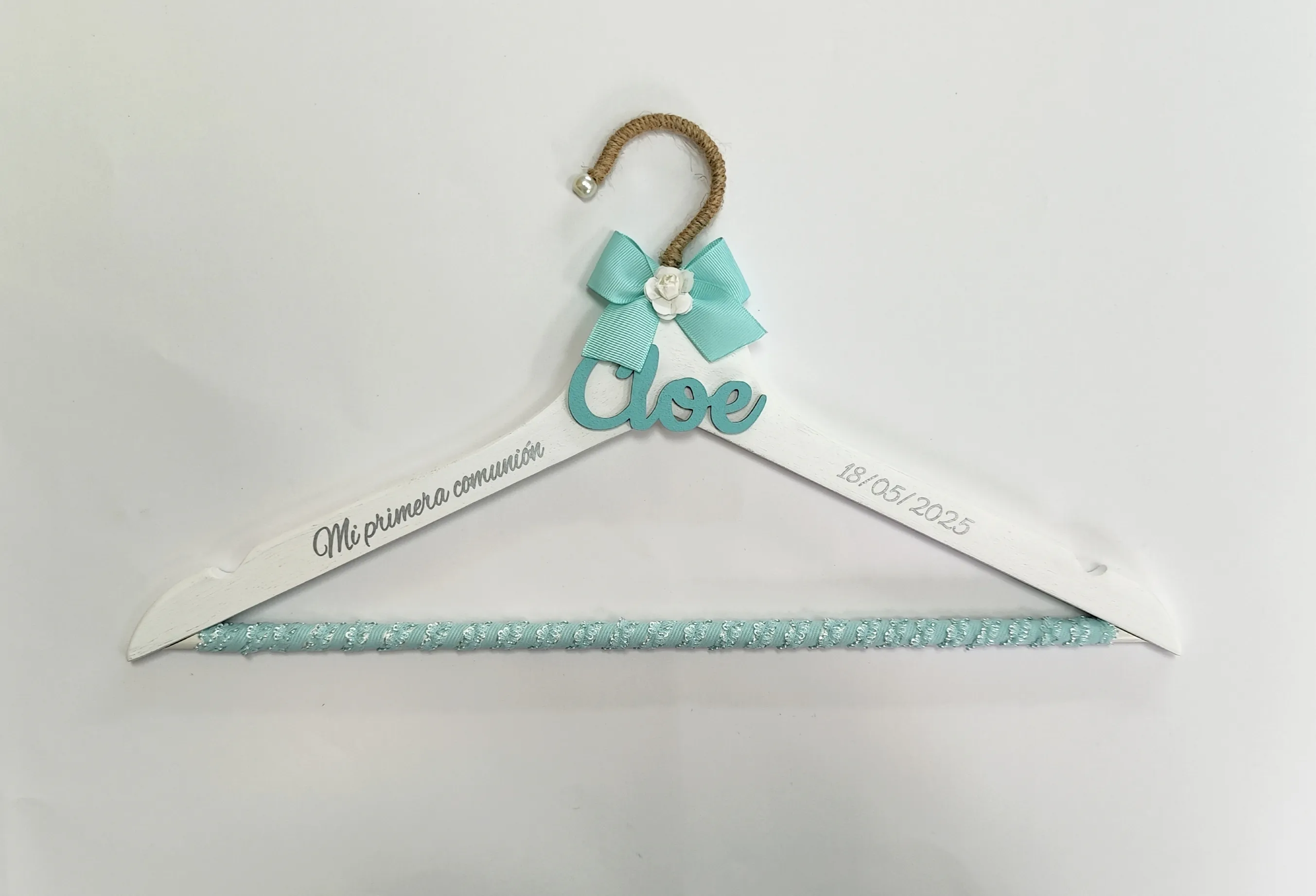 Percha de Primera Comunión en madera blanca. Gancho forrado con yute . Lazo satinado verde menta con rosa blanca.