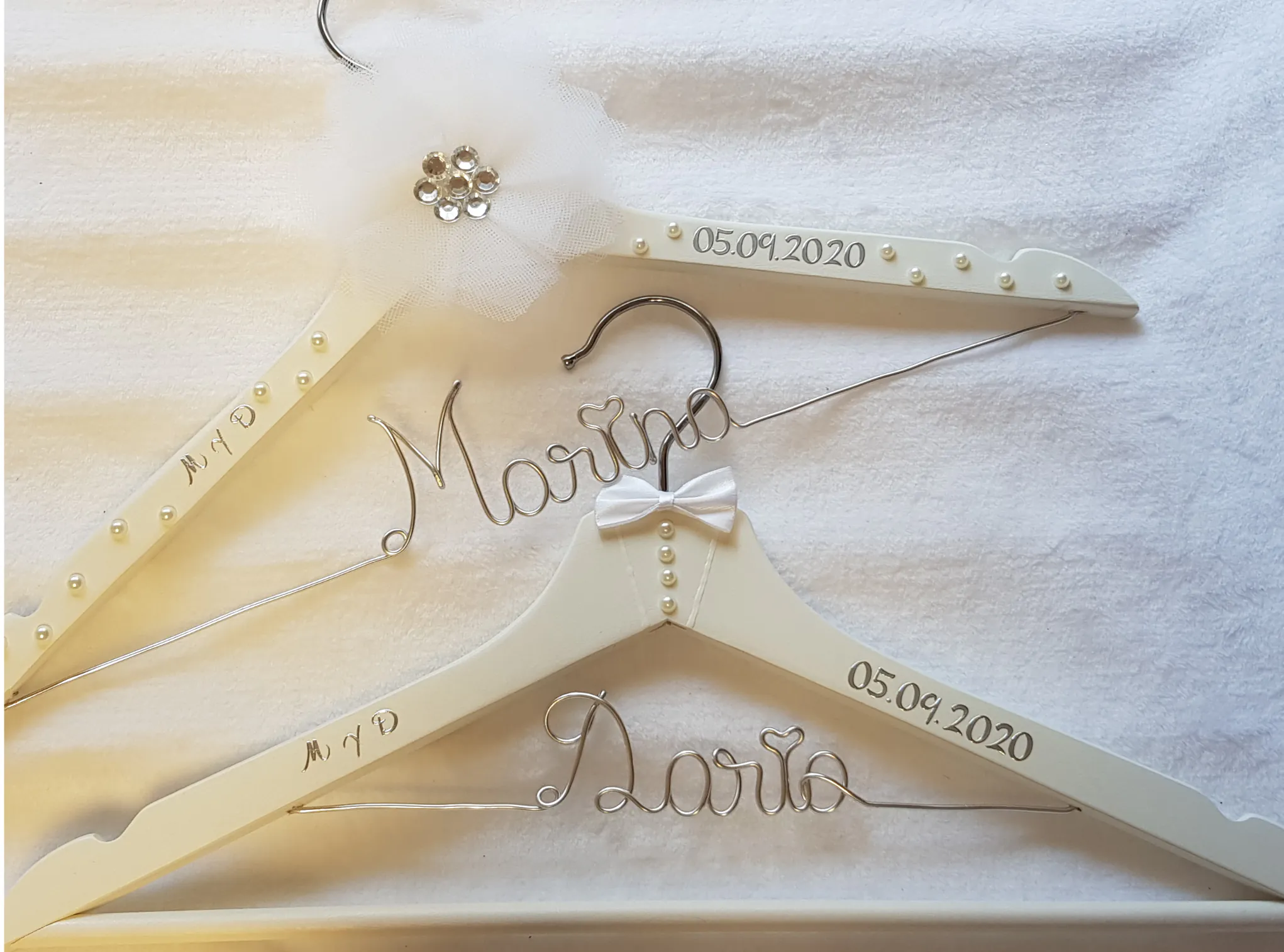Incluye dos perchas a juego: percha de novia con flor de tul y detalles de perlas, y percha de novio con lazo blanco. Nombre en alambre plateado y fecha personalizados.