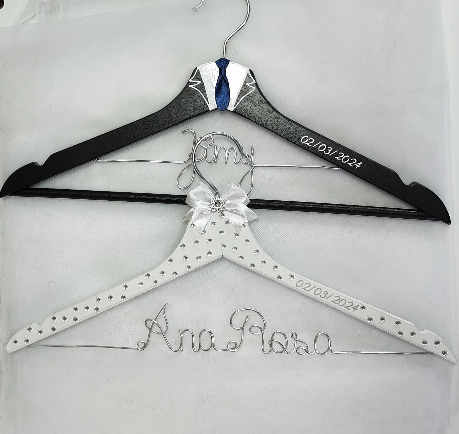 Incluye percha de novia en blanco decorada con cristales y lazo con broche, y percha de novio en negro estilo smoking con corbata azul. Nombre en alambre plateado y fecha personalizados.