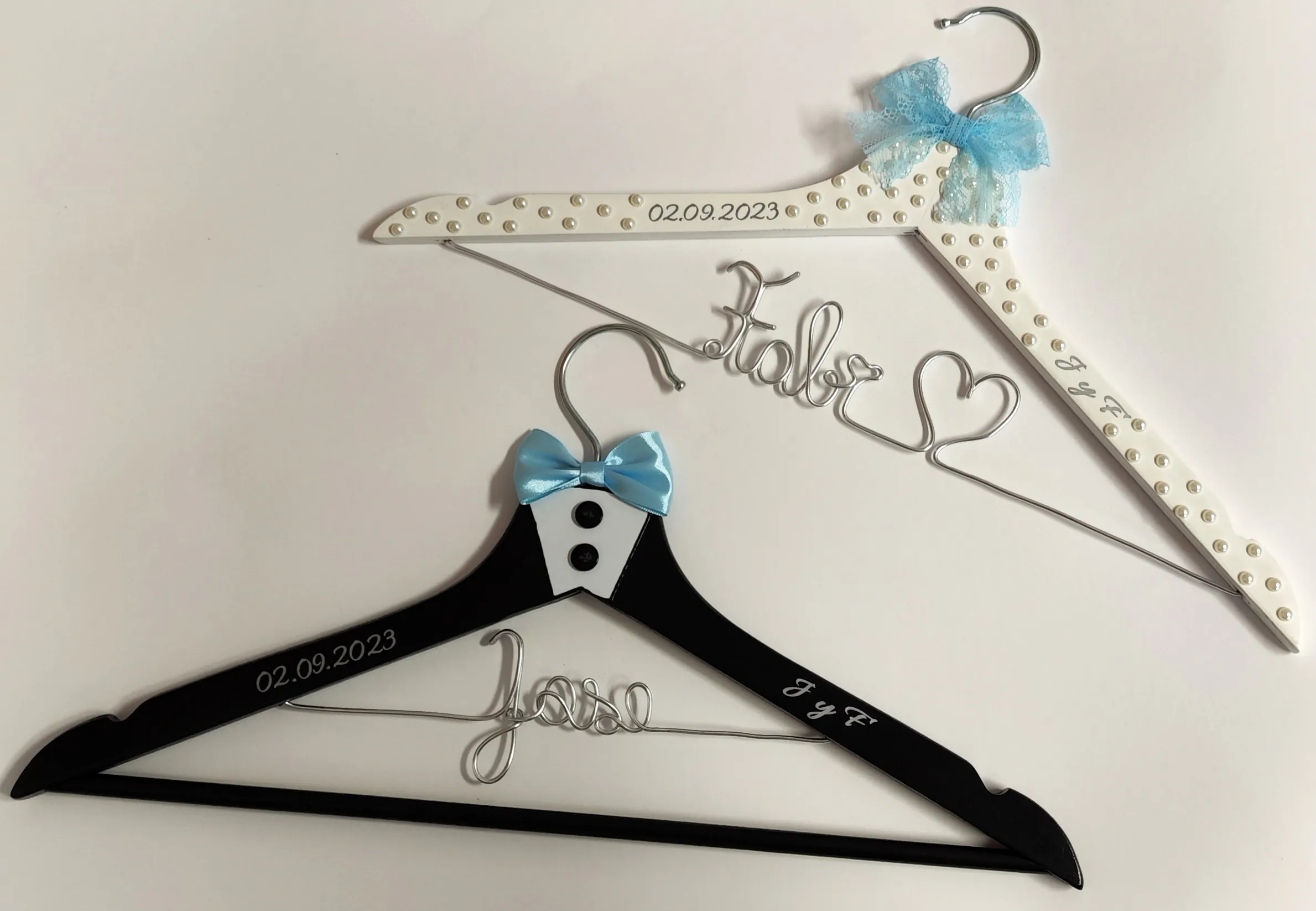 Incluye percha de novia en blanco decorada con perlas y lazo de encaje azul celeste, y percha de novio en negro estilo smoking con pajarita azul. Nombre en alambre plateado con corazรณn y fecha personalizados.