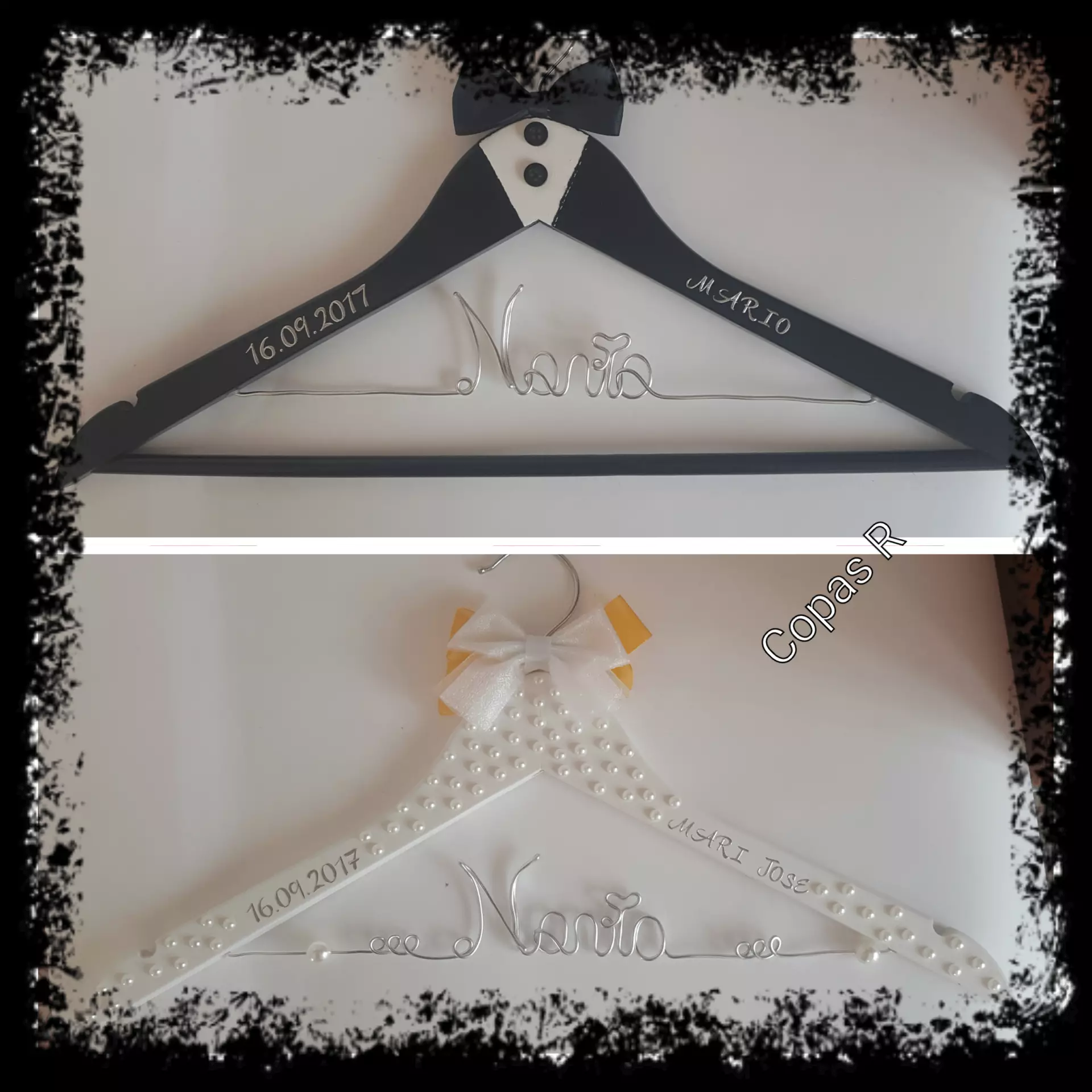 - Perchas para boda: tanto el traje en perchas para novios como el vestido en perchas de boda decoradas. Las perchas personalizadas son la mejor opción para esas fotos inéditas que saldrán a la luz después de la boda, con el vestido y el traje colgados en sus perchas, listos para el magno evento que se llevaría a cabo.