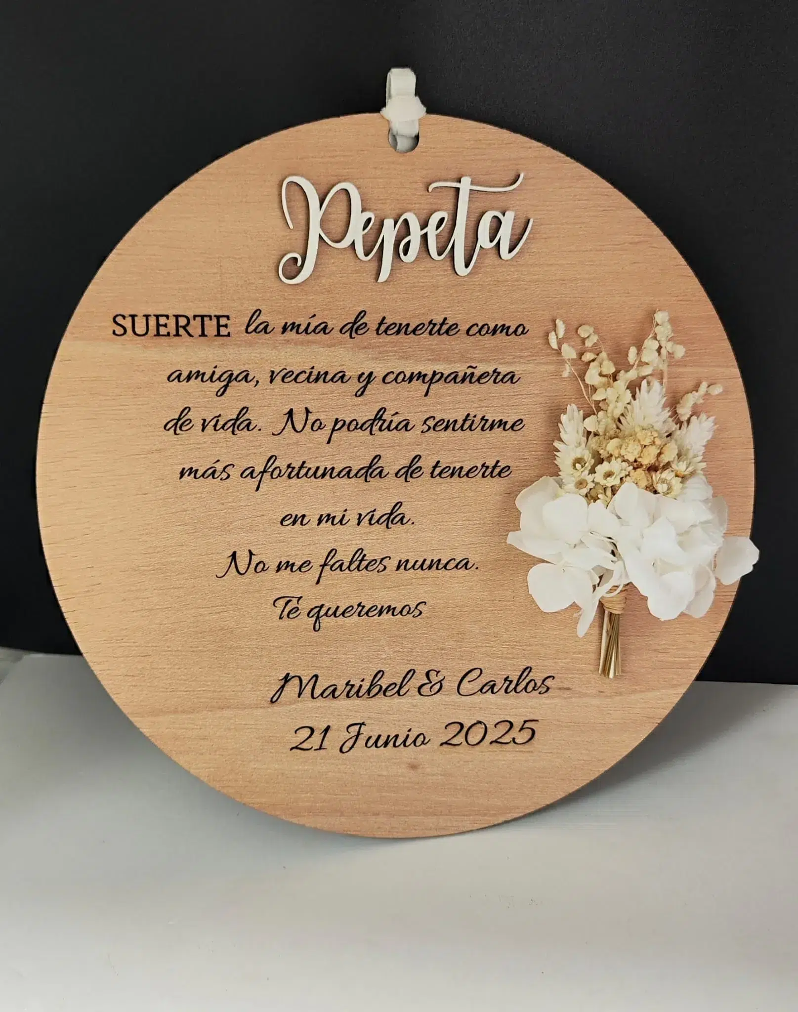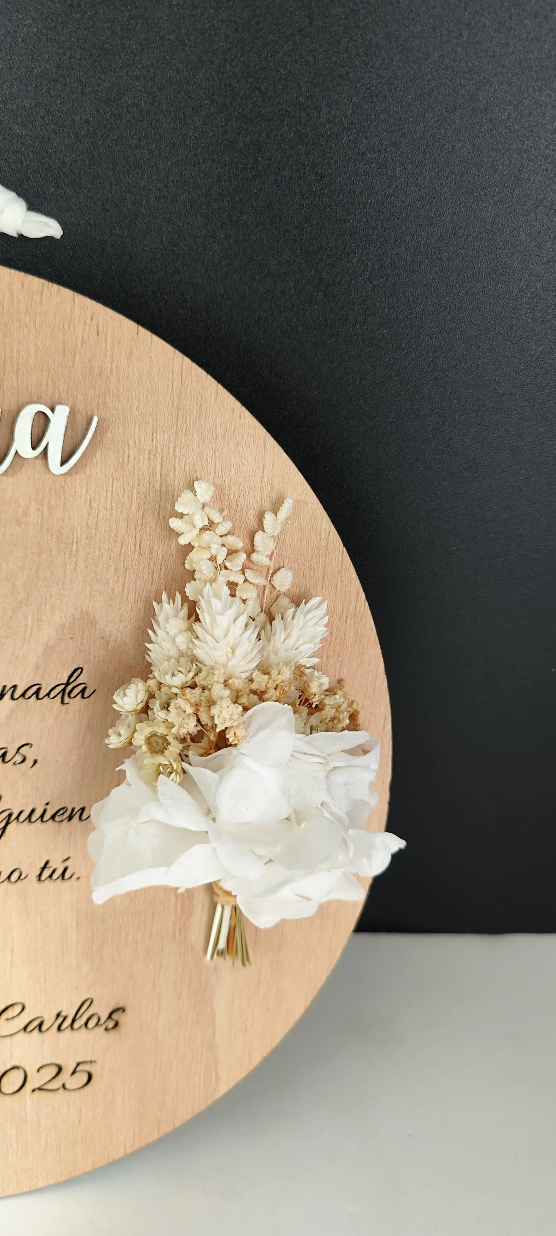 Si buscas un regalo único y emotivo, esta placa de madera personalizada con grabado láser y flores preservadas es perfecta. Es ideal para crear recuerdos que duran y sorprender en ocasiones especiales.
