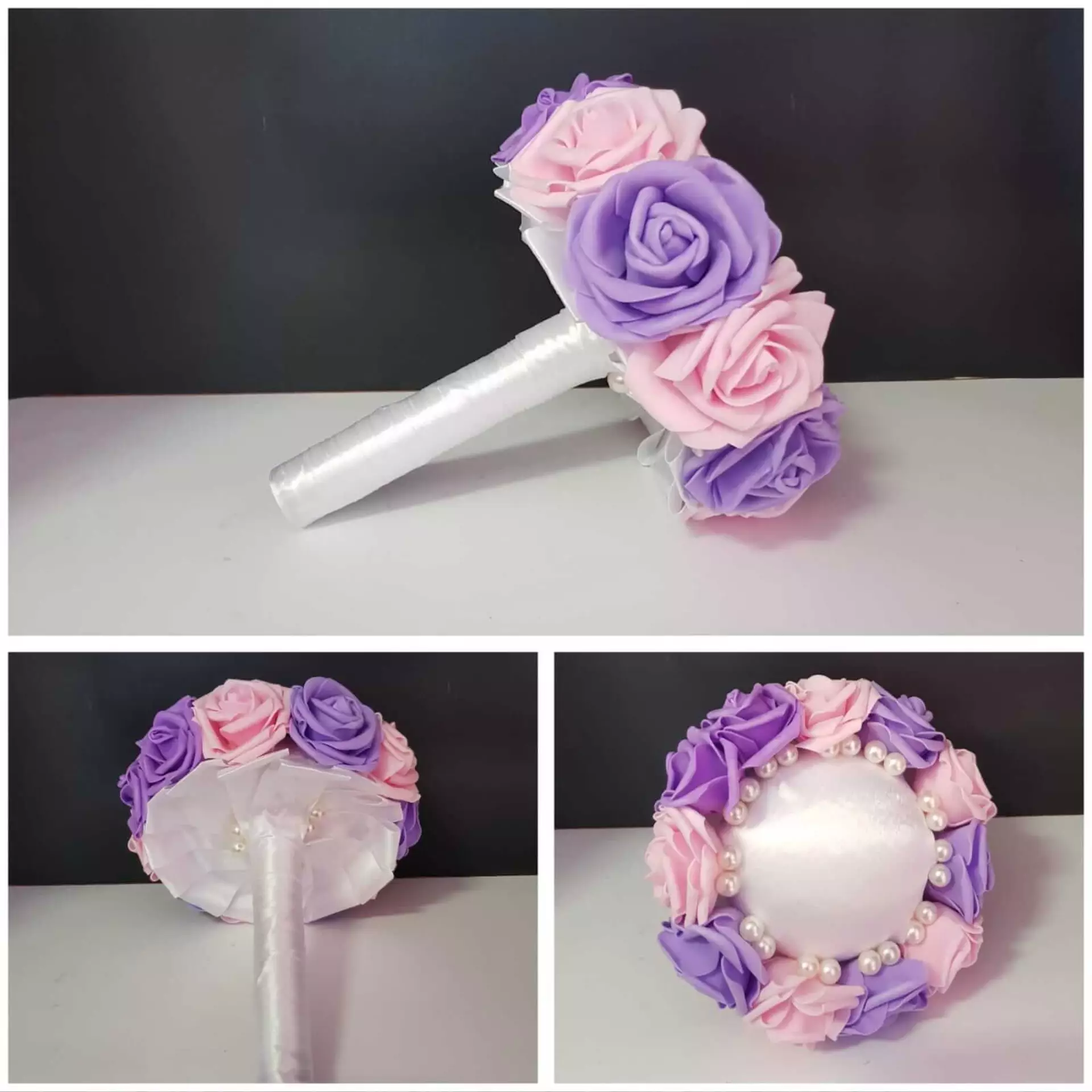 Diferentes tipos de ramos hechos en una base de porexpan y diferentes materiales como cinta de satin,rosas de goma eva etc.