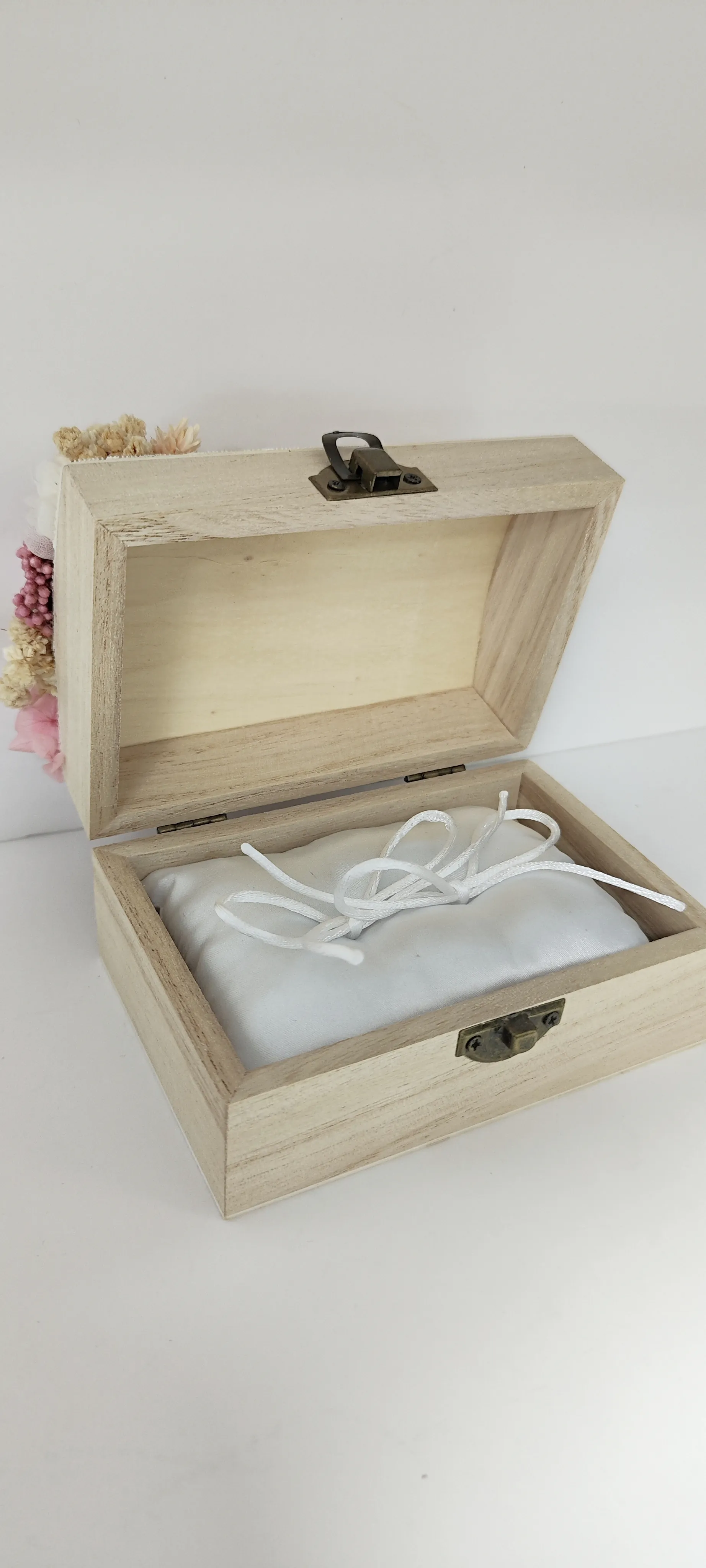 Porta alianzas de madera decorado con flores preservadas en tonos rosa, blanco y beige.