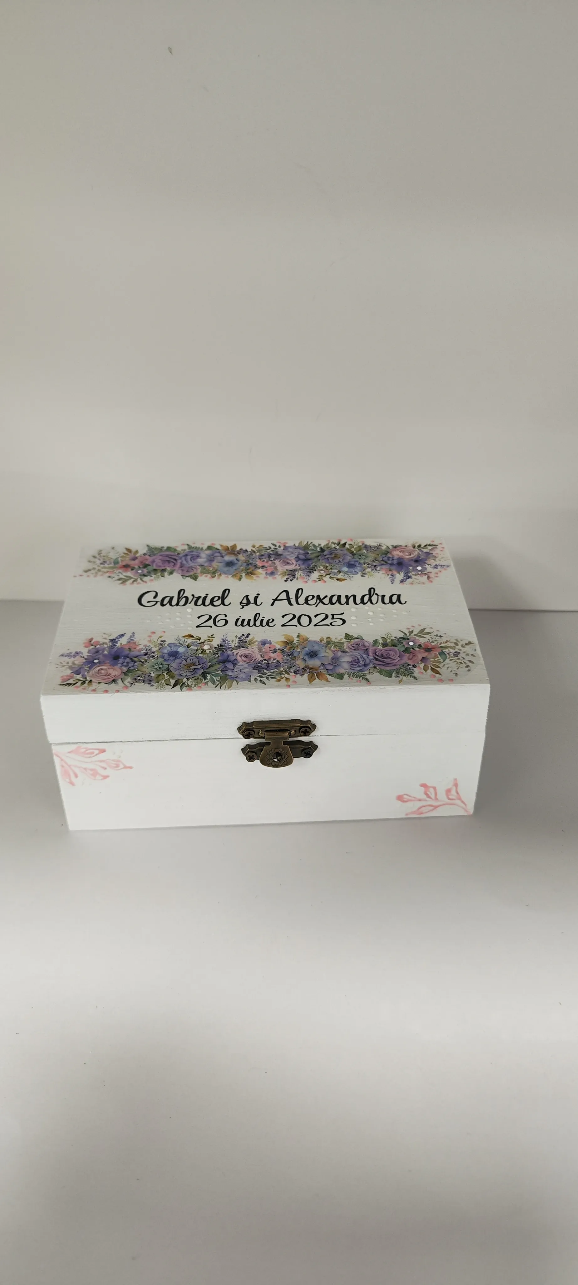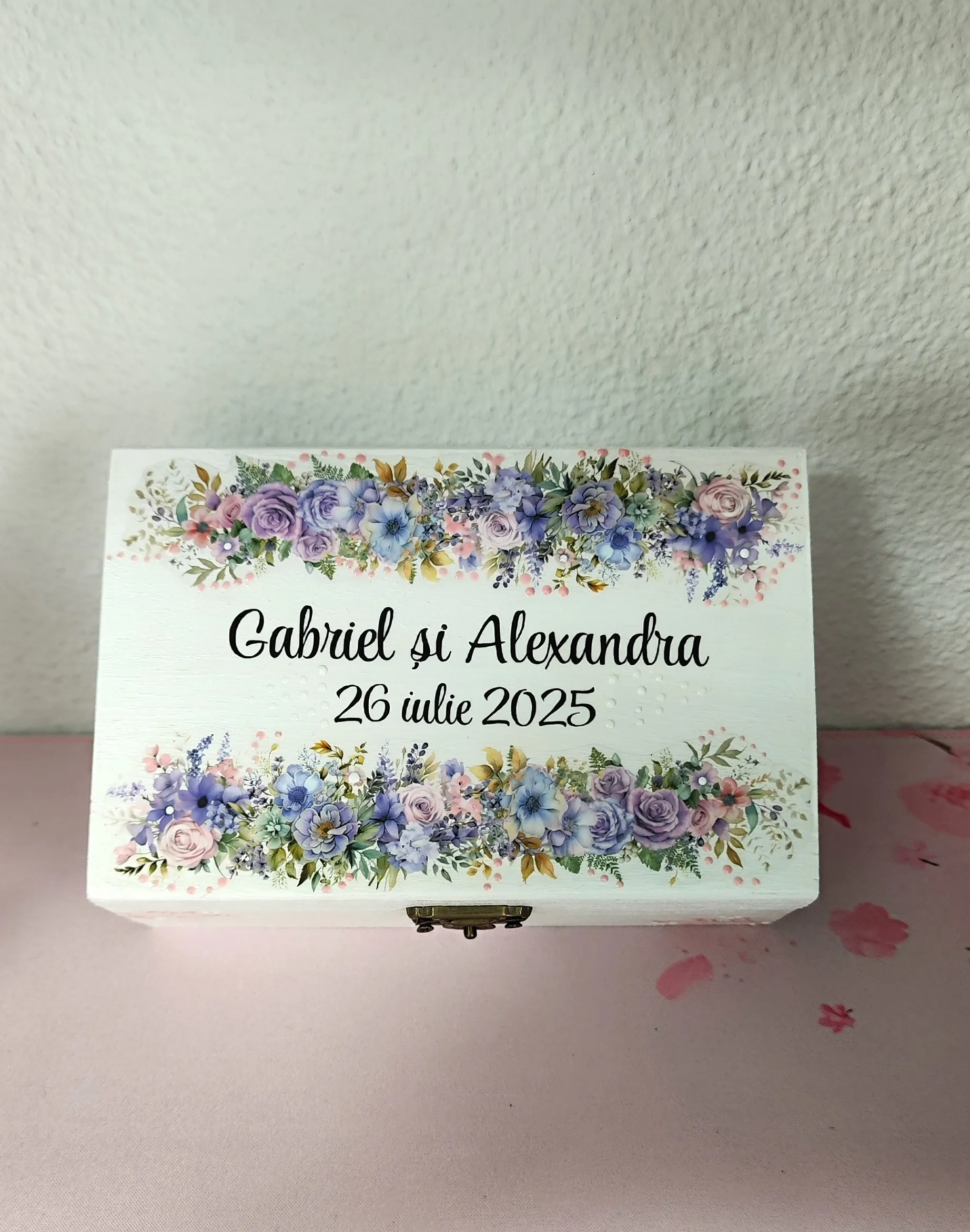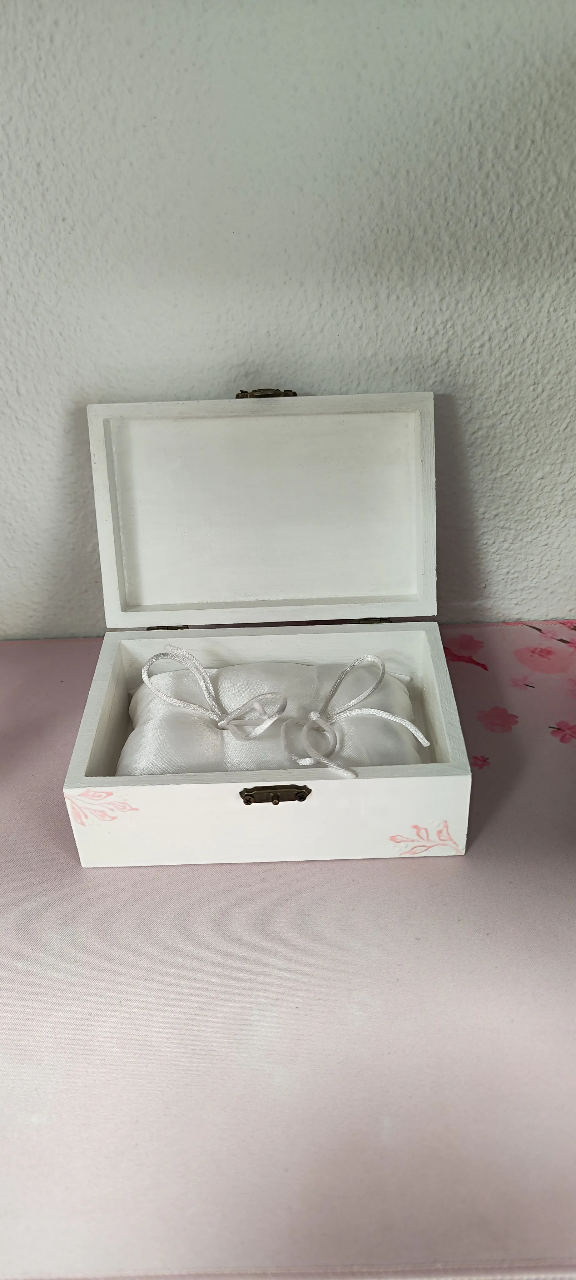 Porta alianzas de madera pintada blanco decorado con flores ilustradas en tonos lila, azul y rosa.