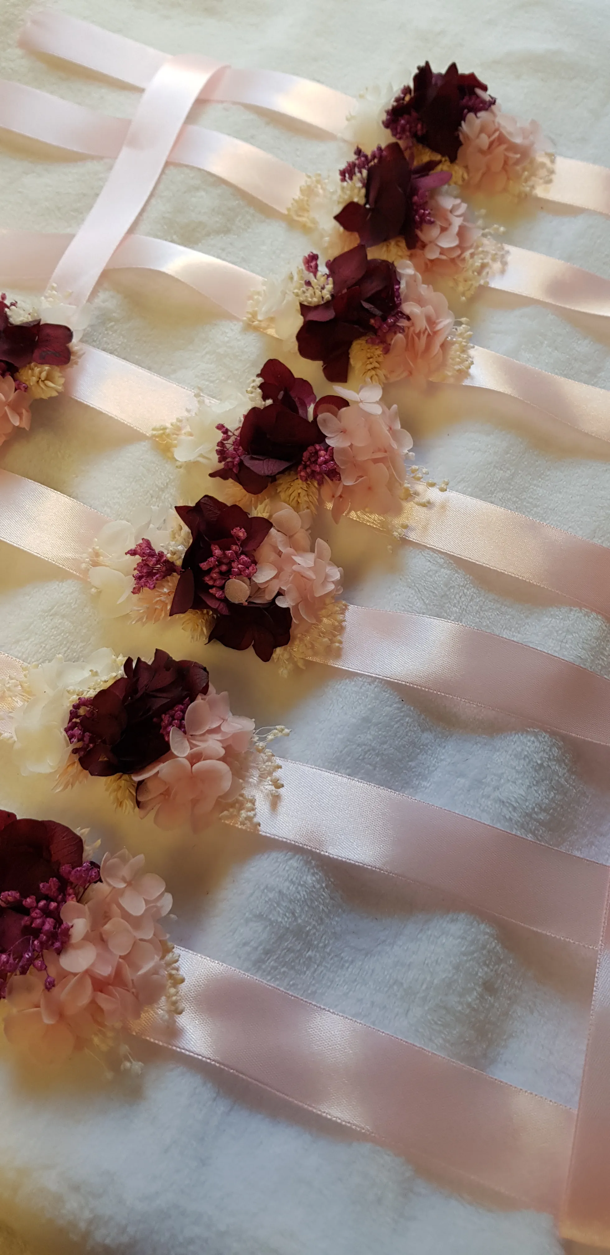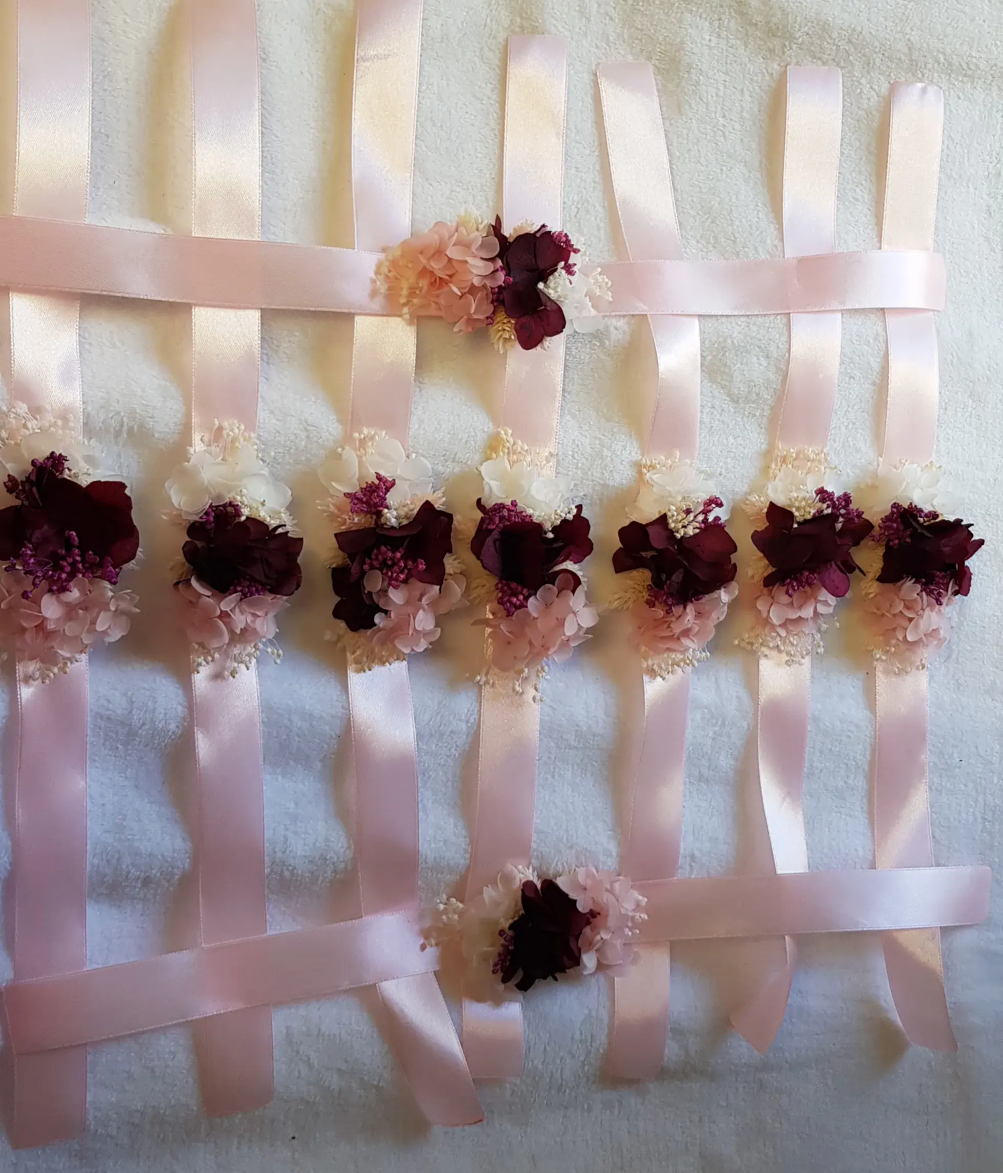 Elegante pulsera para damas de honor con arreglo floral con flores burdeos, rosa palo, blancas y cremá. Cinta de satén rosa con cierre metálico.