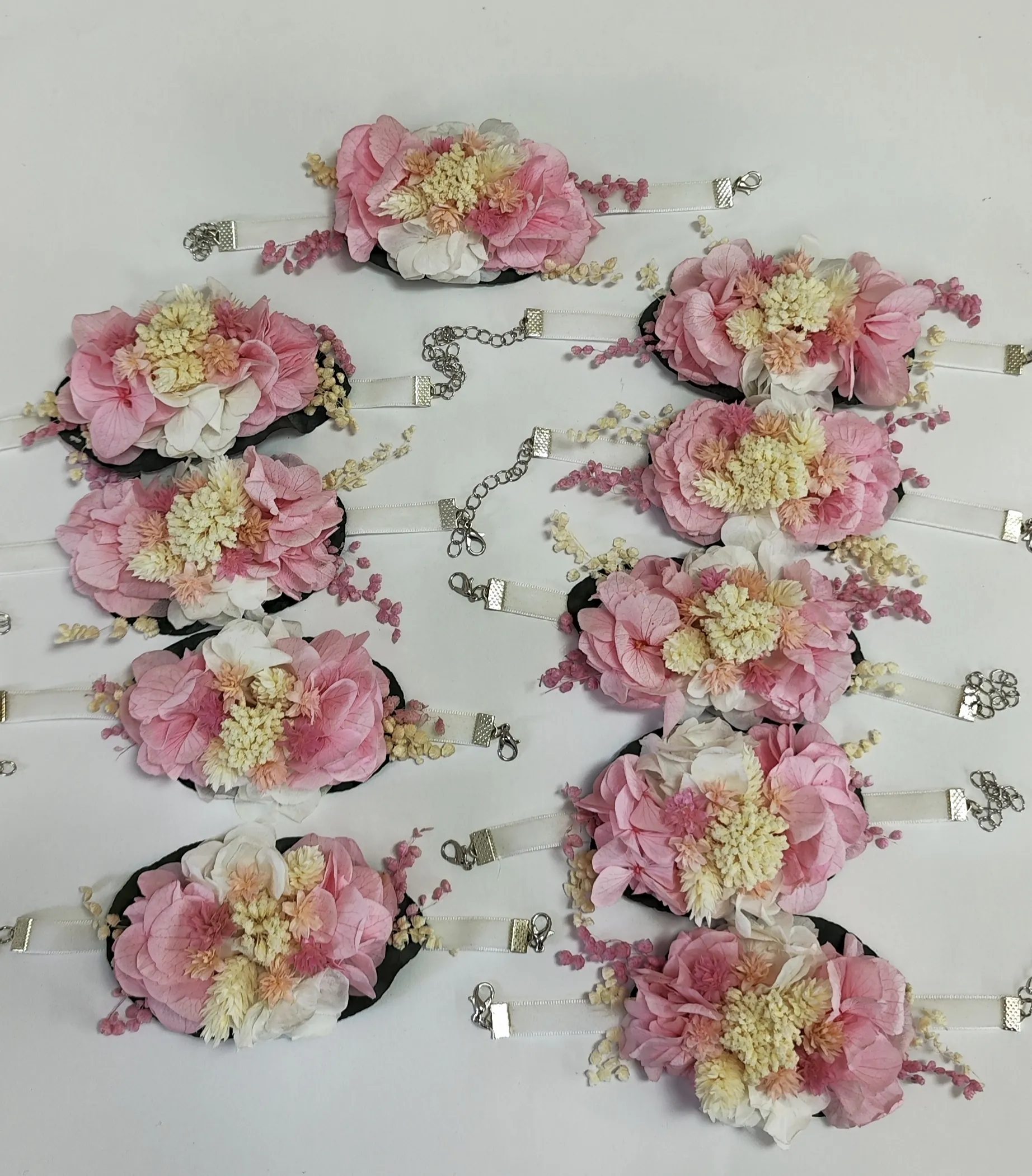 Pulsera para dama de honor decorada con flores preservadas en tonos rosa empolvado, cremá y blanco.