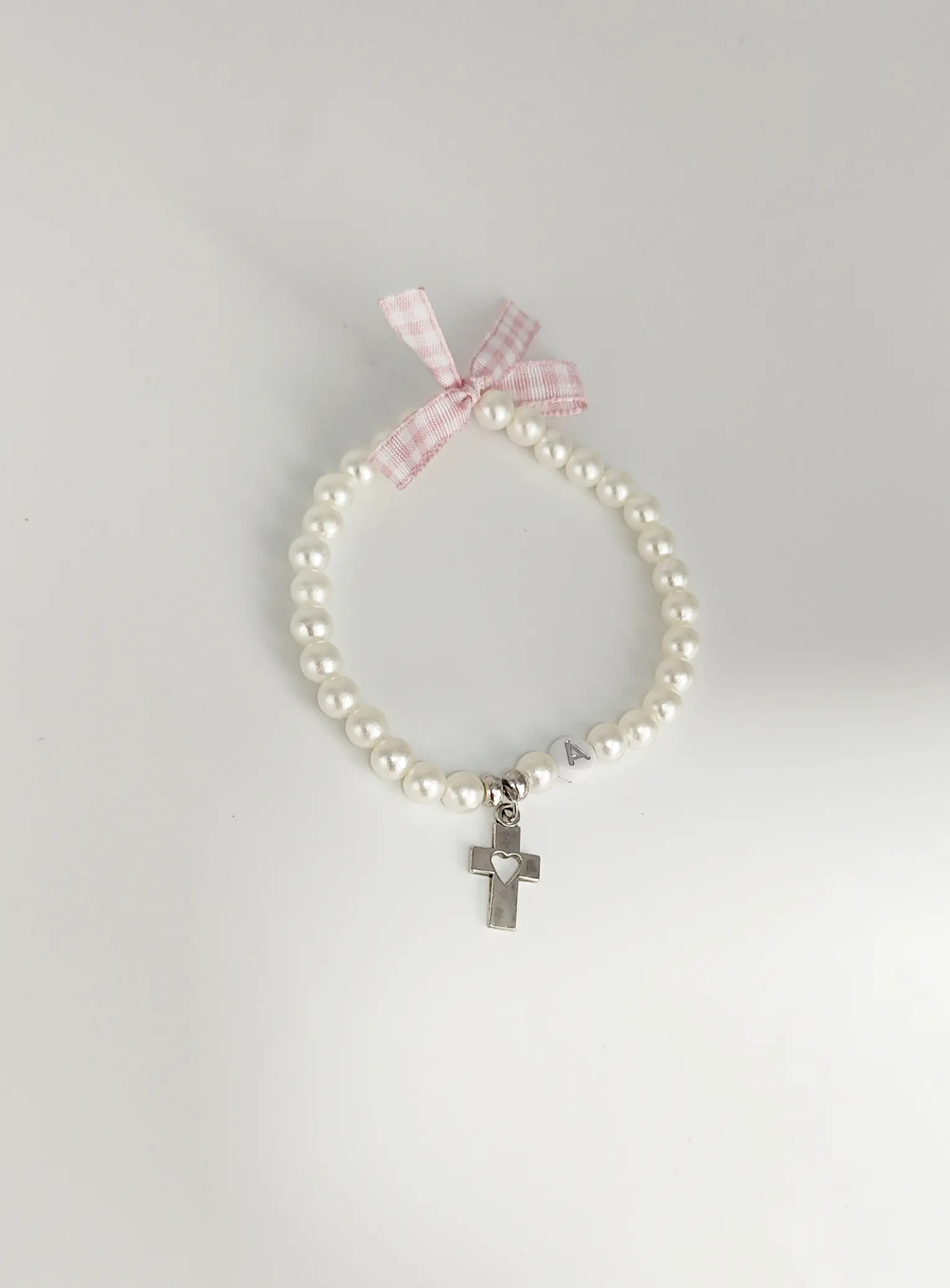 Diseño refinado con perlas blancas nacaradas, lazo de tela rosa con cuadros vichy y cruz de plata con detalle de corazón.