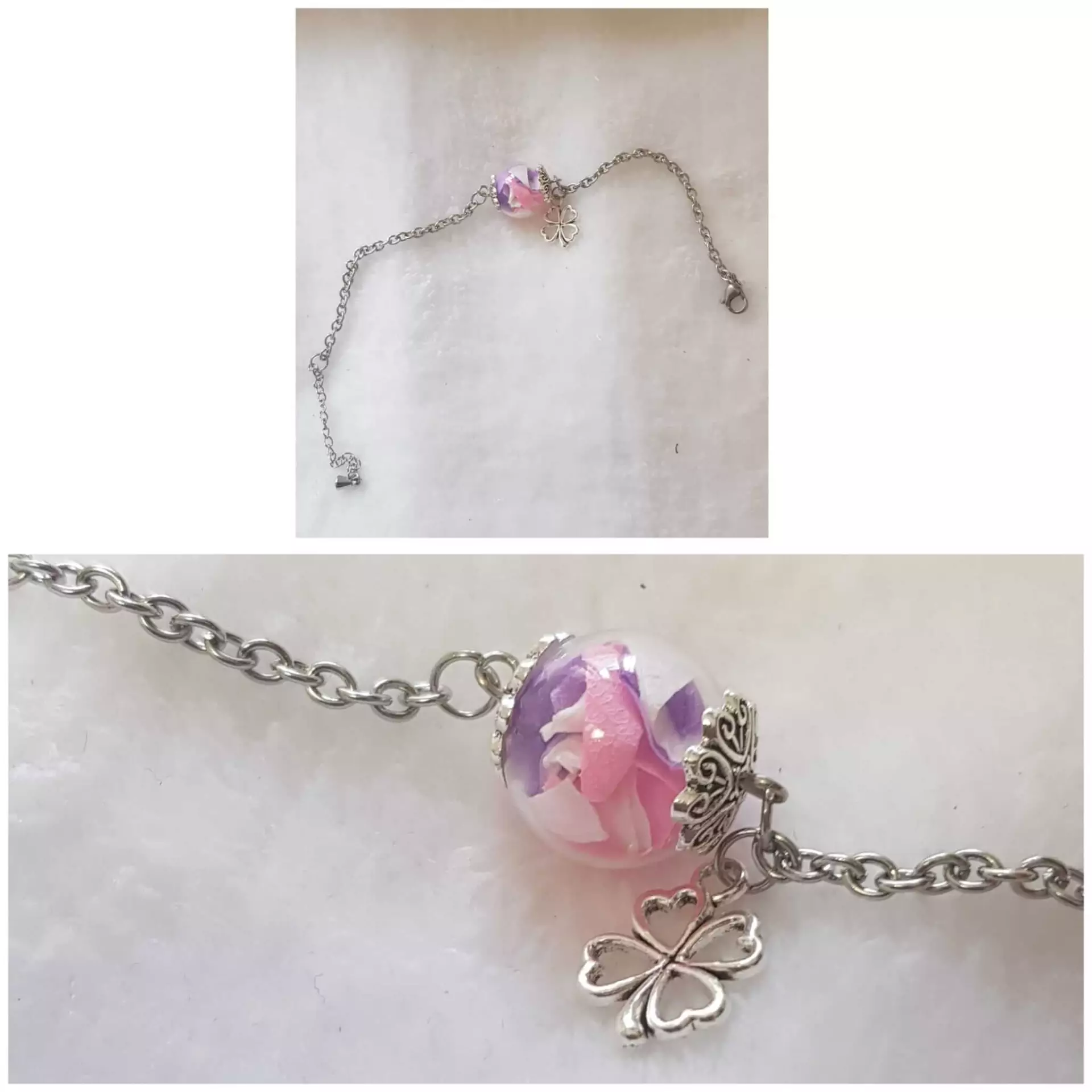 Un bonito recuerdo de tu boda para tus invitados y que se puede usar mucho tiempo. - Pulsera de acero inoxidable con una bolita de cristal(18mm) muy resistente que lleva dentro flores naturales secas y preservadas en los colores de tu ramo.