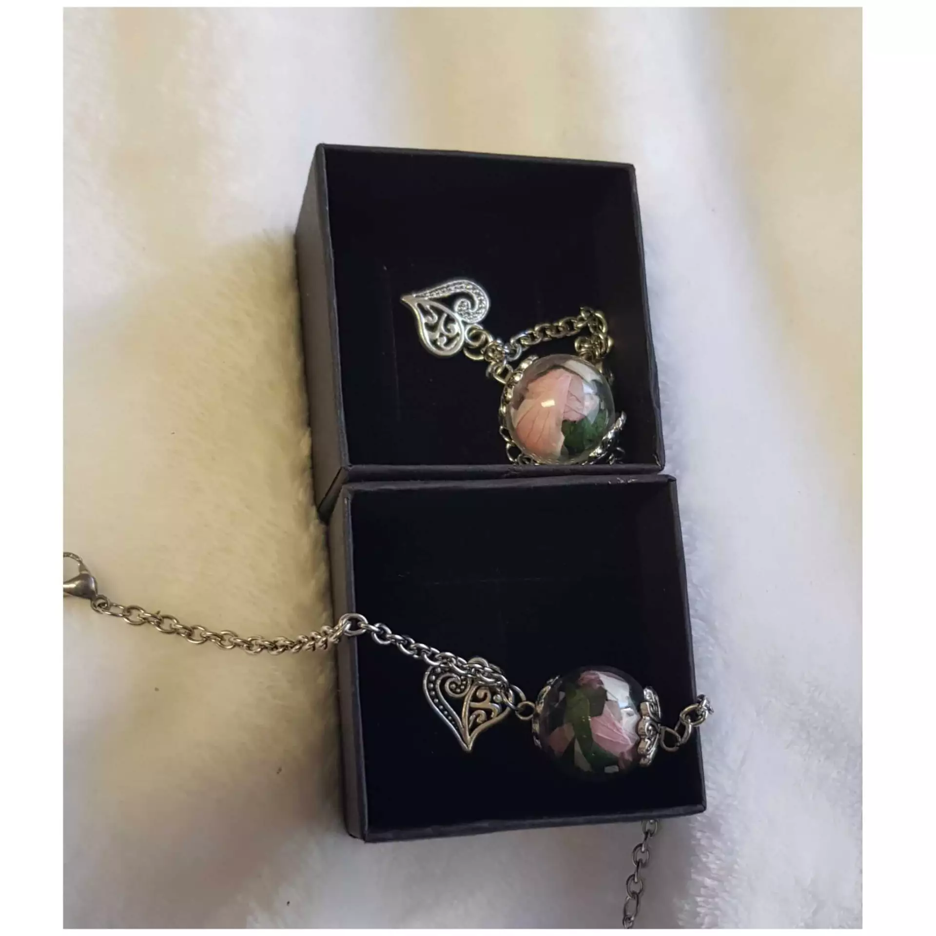 Un bonito recuerdo de tu boda para tus invitados y que se puede usar mucho tiempo. - Pulsera de acero inoxidable con una bolita de cristal(18mm) muy resistente que lleva dentro flores naturales secas y preservadas en los colores de tu ramo.