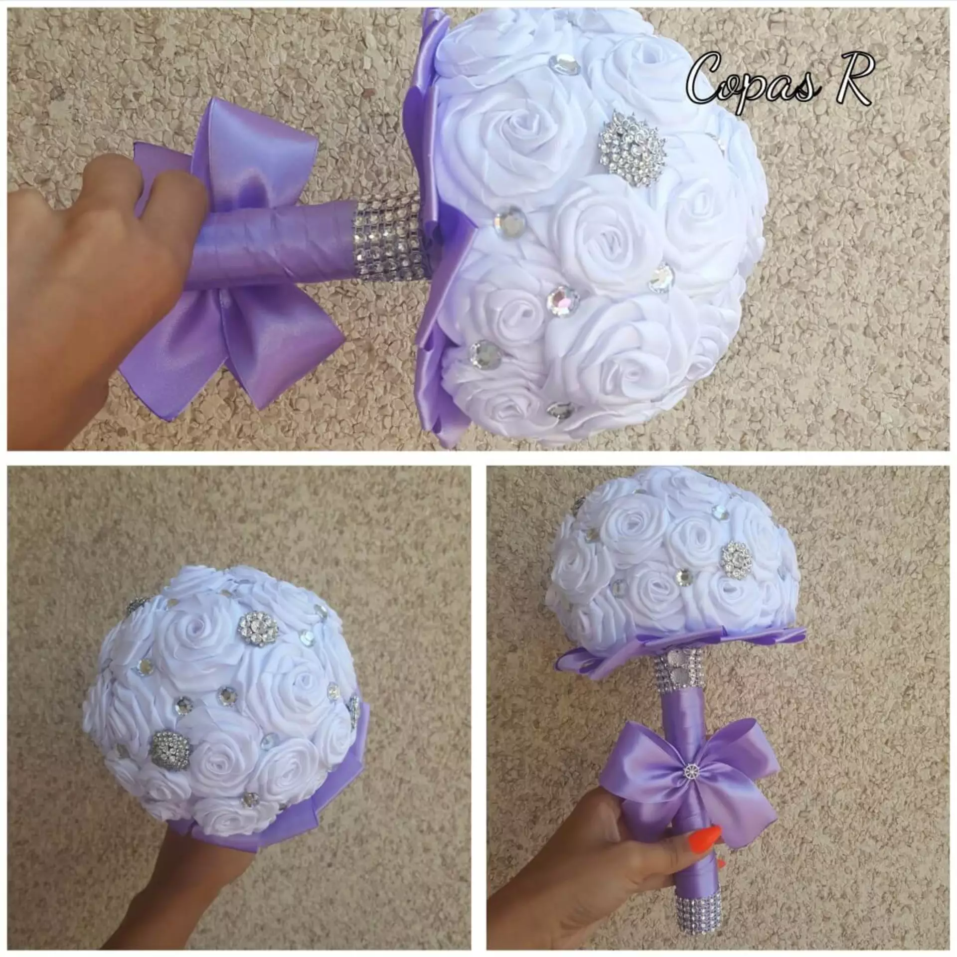- Ramo con rosas hechas a mano con cinta de raso,brillantes, pendientes