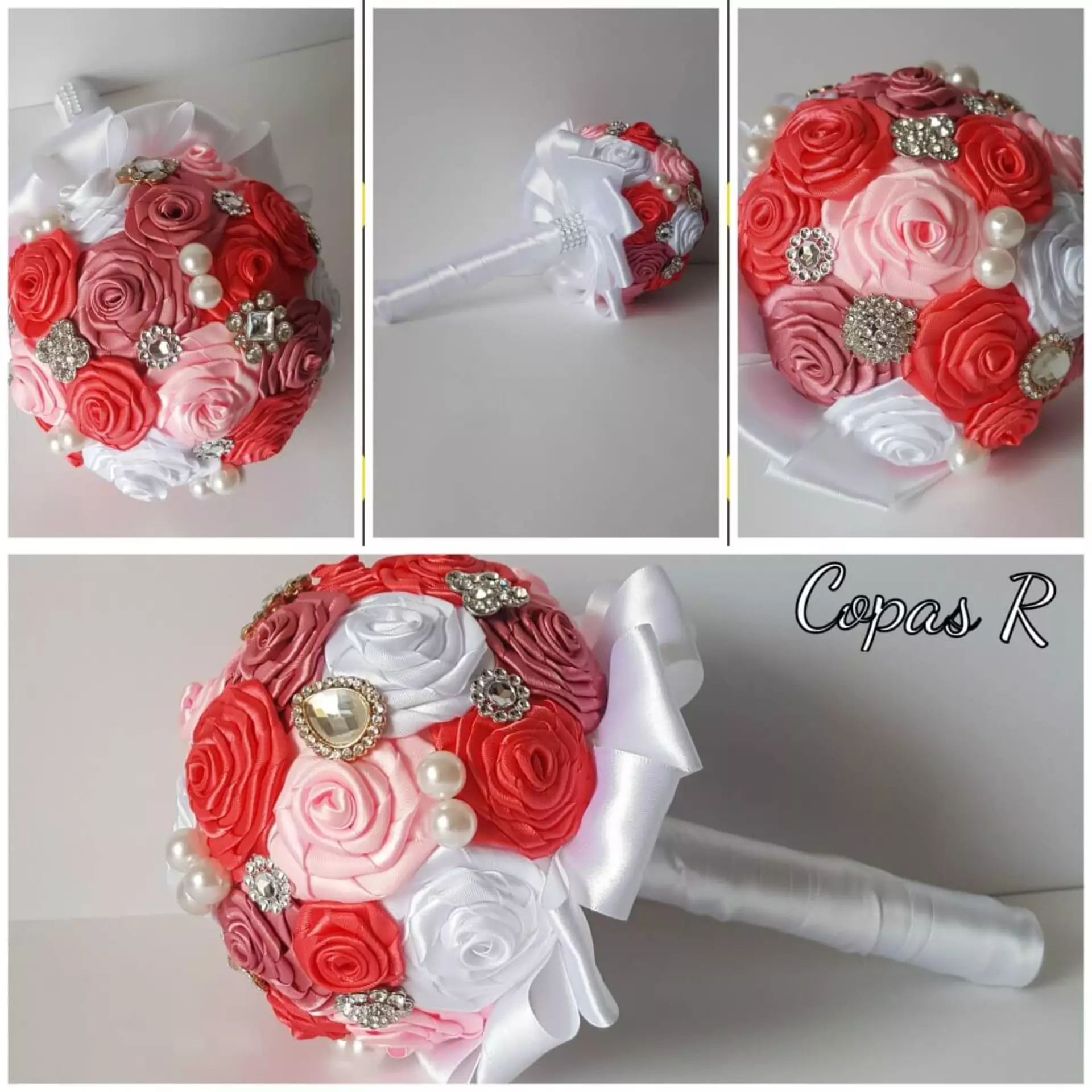 - Ramo con rosas hechas a mano con cinta de raso,perlas, pendientes