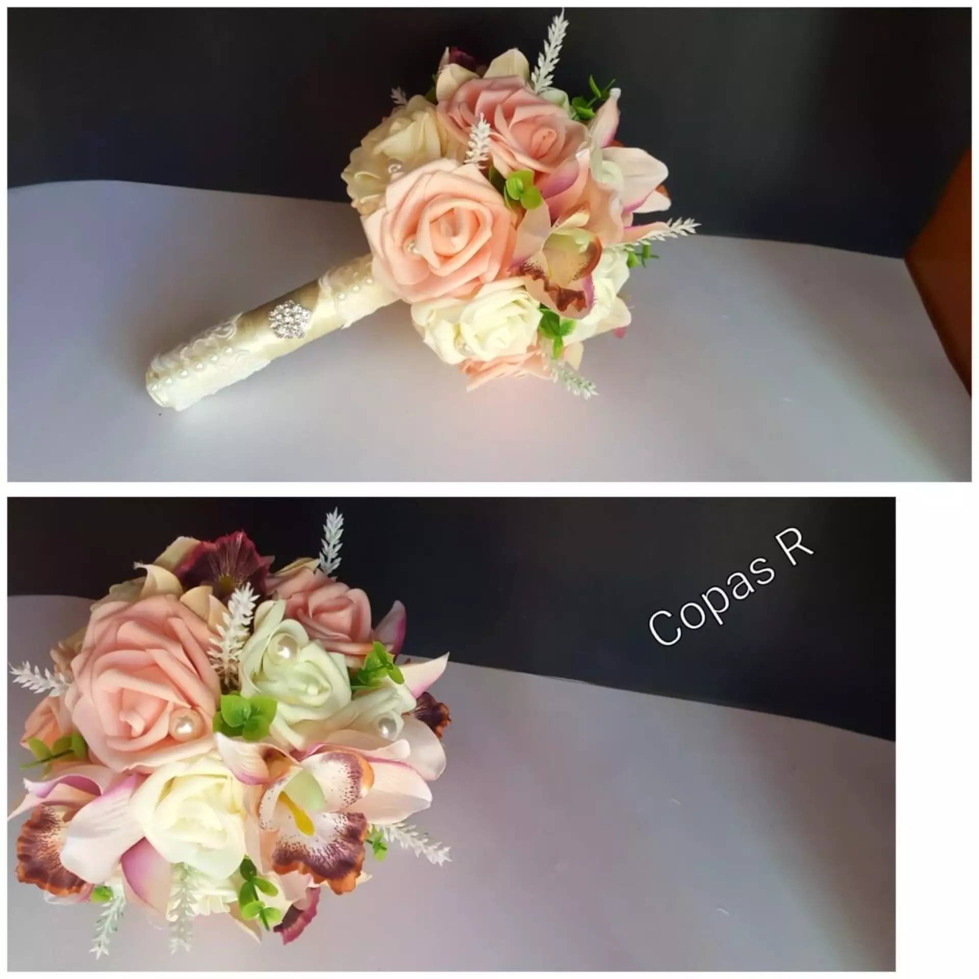 - Ramo con rosas de goma eva,flores de tela,lavanda blanca,perlas