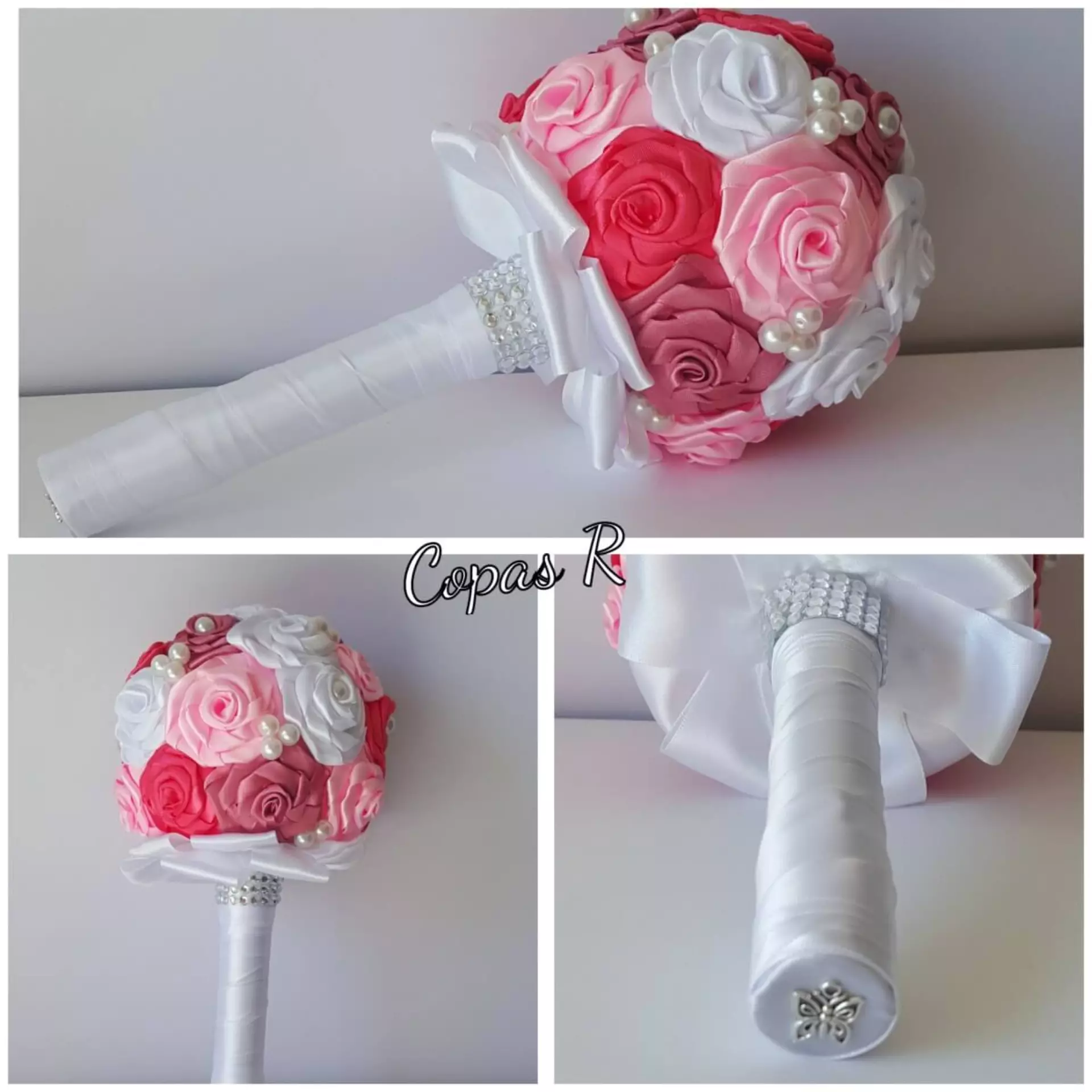 - Ramo con rosas hechas a mano con cinta de raso,perlas