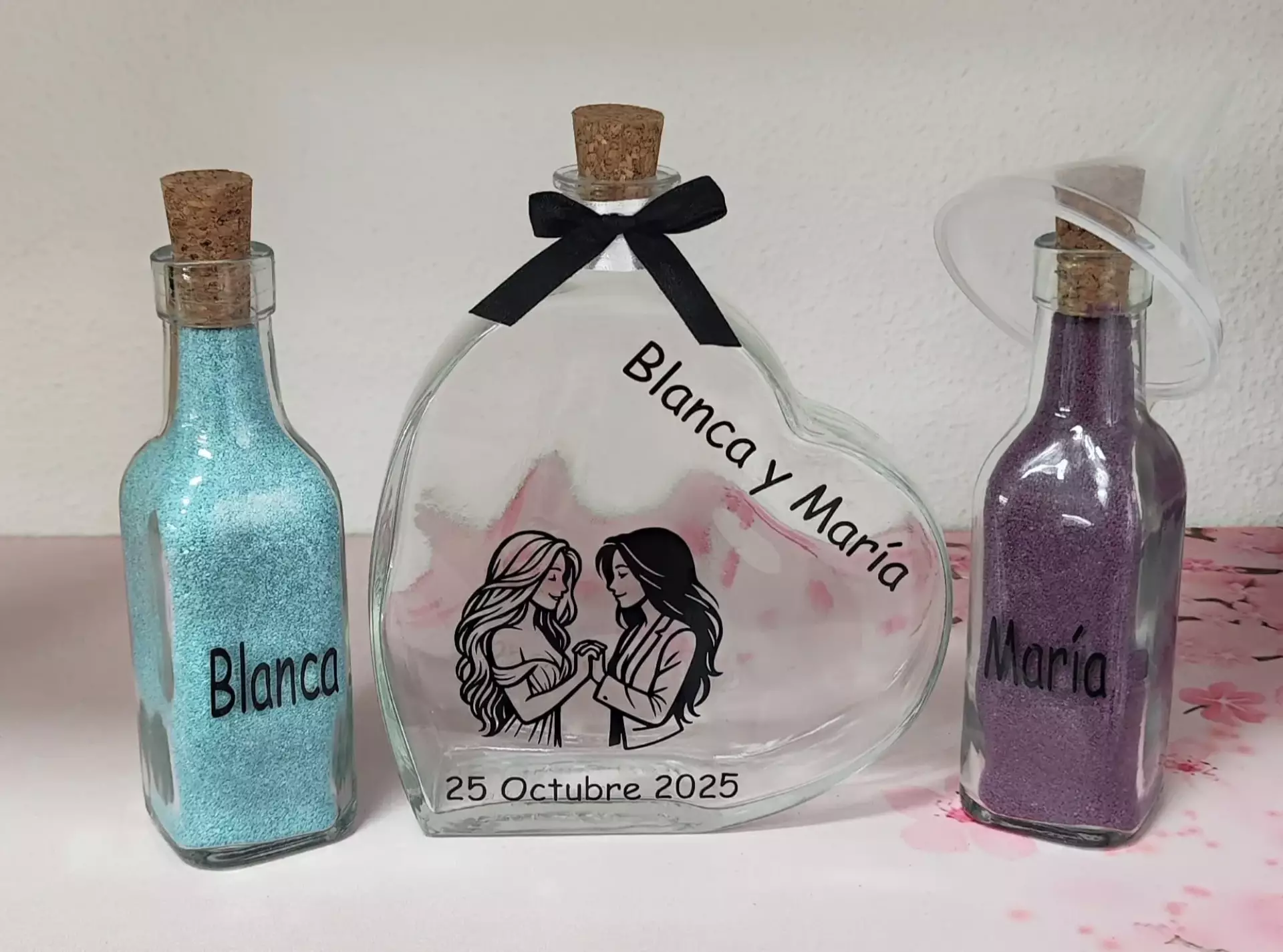 Celebra vuestro amor con un elegante set de ceremonia de la arena personalizado con vuestros nombres y fecha especial. Ideal para bodas, aniversarios o ceremonias simbólicas. Incluye botella de cristal en forma de corazón y dos botellas con arena de colores a elegir.