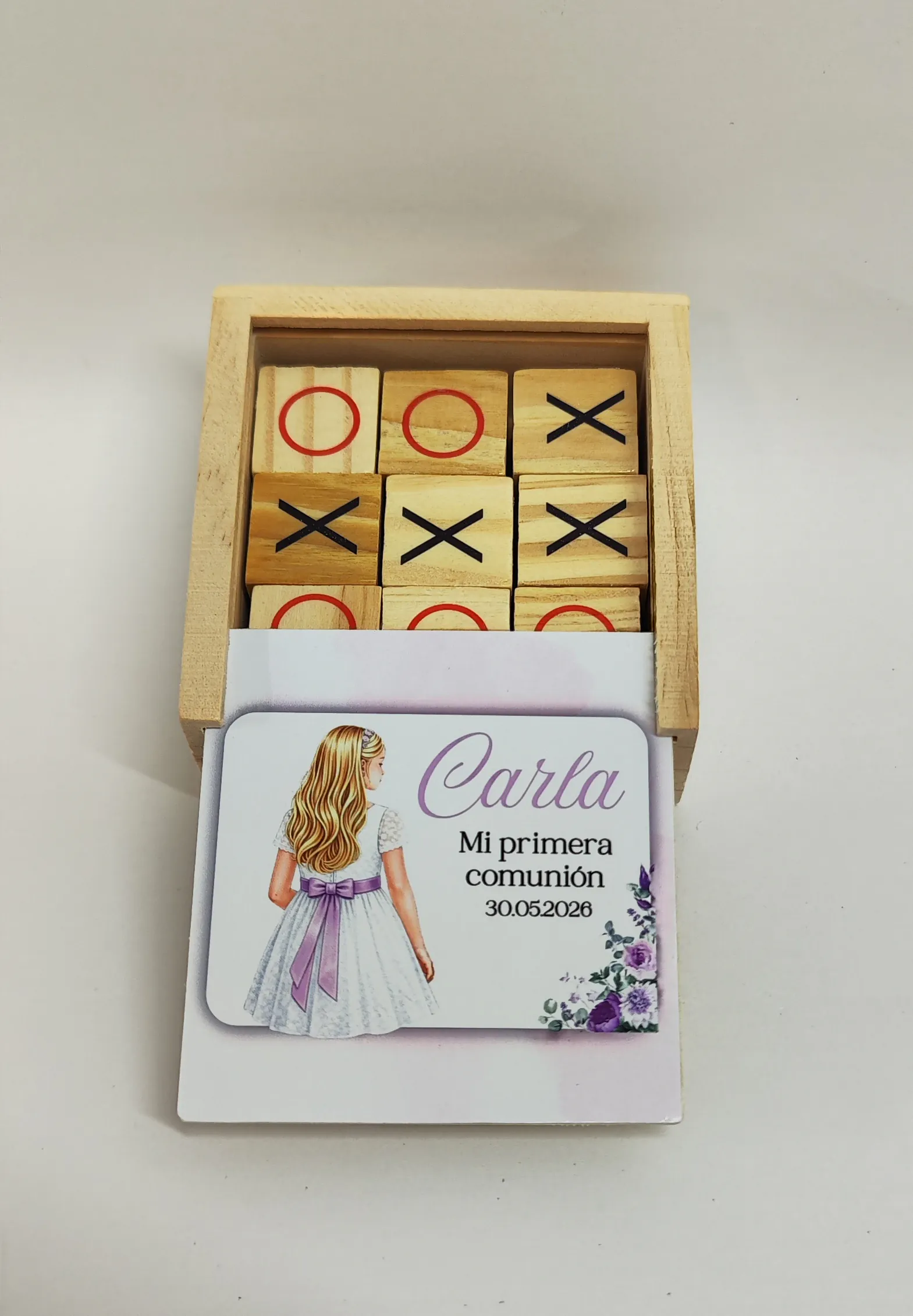 Caja de madera con 9 fichas (X y O). La tapa se personaliza con nombre y fecha de la comunión. Incluye bolsita y lazo. Pedido mínimo 6 unidades.