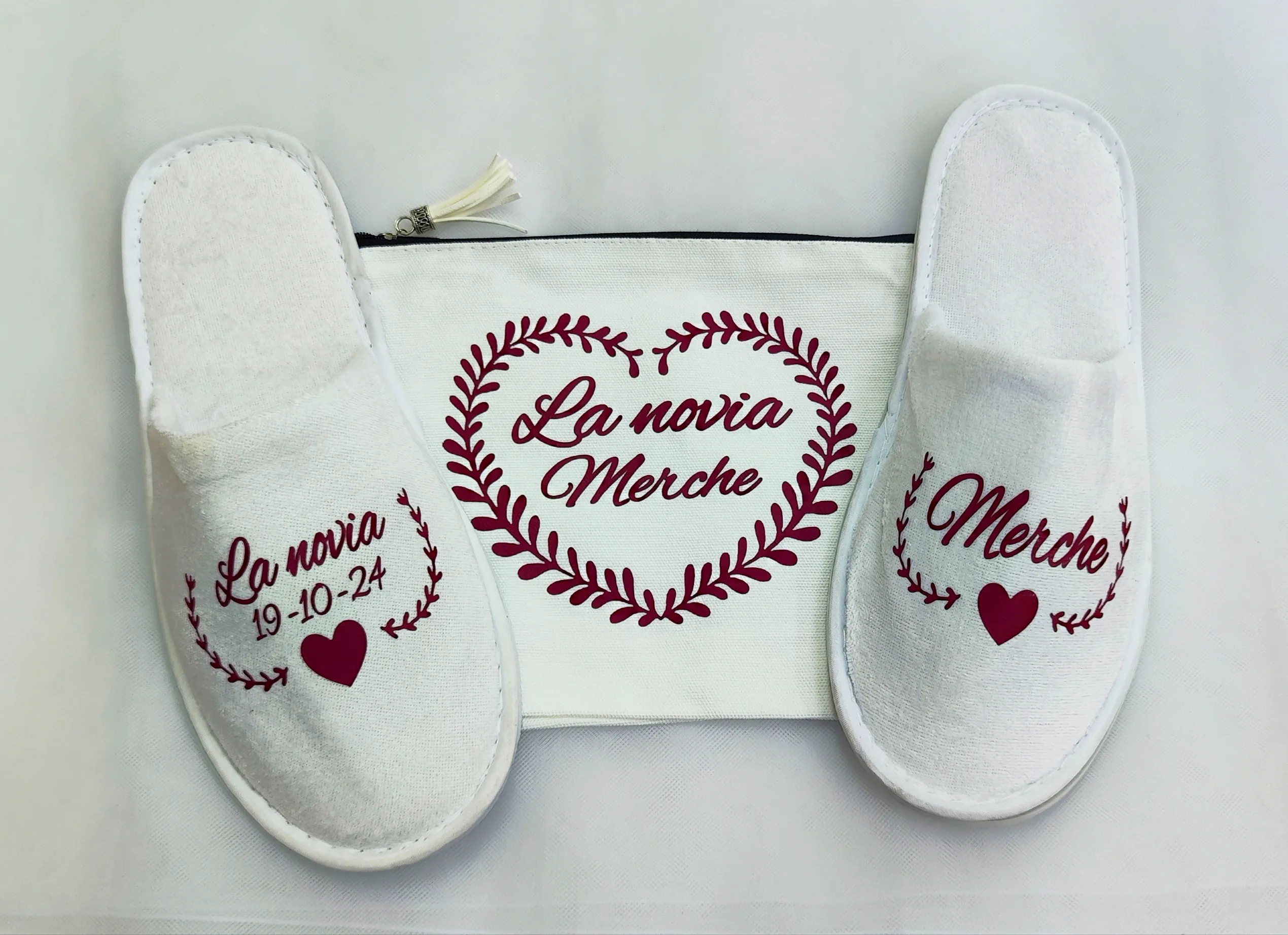 Set completo de zapatillas y neceser personalizados para novia.